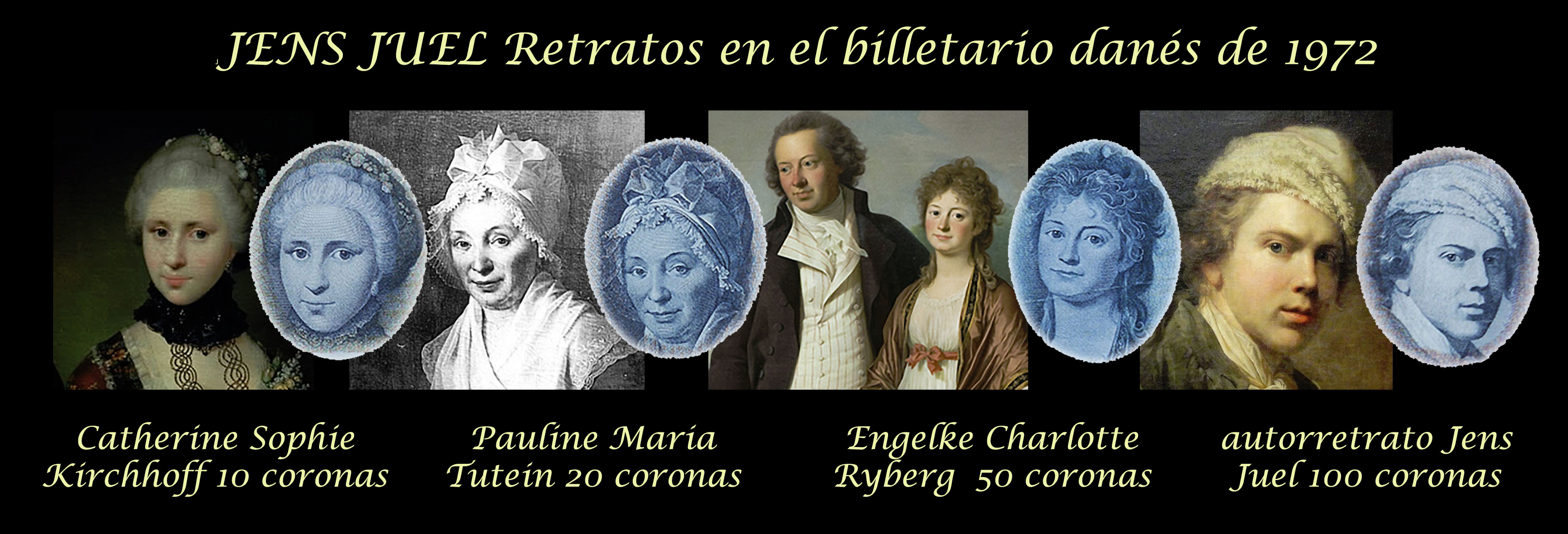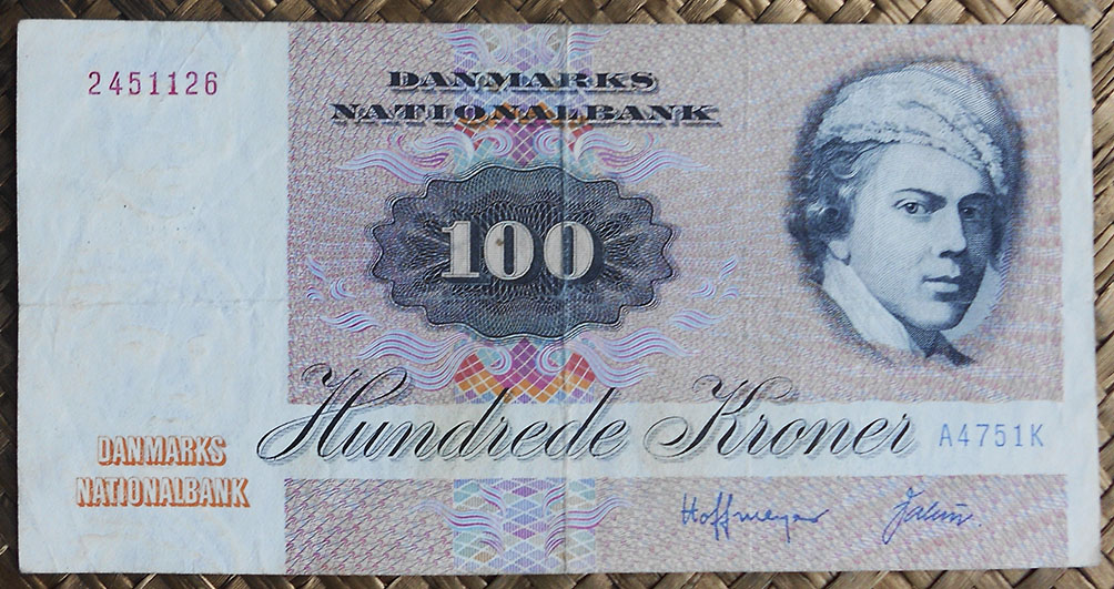 El billete de 100 coronas de Dinamarca de 1975 nos muestra en su anverso el autorretrato del pintor Jens Juel, de 1773-74 a sus 28 años y en su reverso una polilla-mariposa del género Red Underwing sacada de una acuarela del ilustrador Ib Andersen.