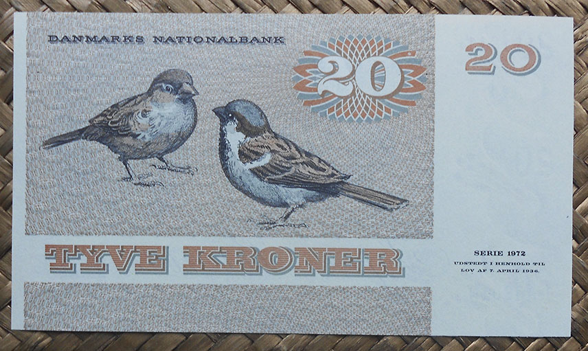El billete de 20 coronas de Dinamarca de 1980 nos muestra en su anverso el retrato pintado por Jens Juel de la cara de Pauline Tutein, danesa casada con el comerciante Peter Tutein (industrial mercante y gran comerciante en la época colonial de Dinamarca -s. XVIII). Para el reverso, gorriones grabados por el ilustrador del Banco Nacional de Dinamarca del momento, Gunnar Andersen (1919-1981). La anécdota de esta composición del reverso se da en la falta de una pata en uno de los gorriones dibujados (el gorrión de la derecha solo se apoya en una pata, no mostrando la otra en el grabado).