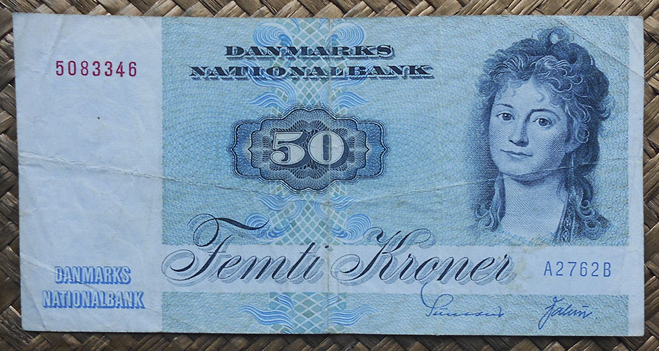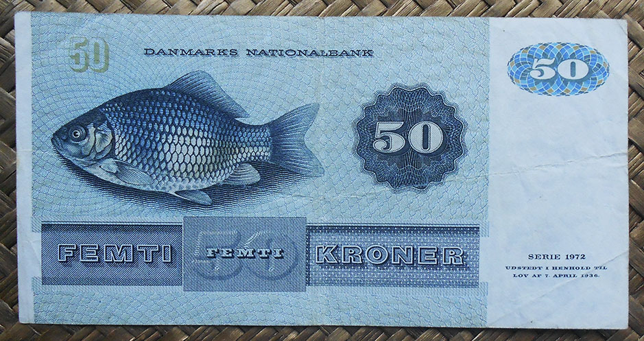 El billete de 50 coronas de Dinamarca de 1976 nos ofrece en su anverso el retrato de la cara de Engelke Charlotte Ryberg , detalle de un retrato de familia pintado por Jens Juel en 1796. Para su reverso nos muestra un pez del género carpa dorada, que reproduce un dibujo del ilustrador y arquitecto Ib Andersen (1907-1969).