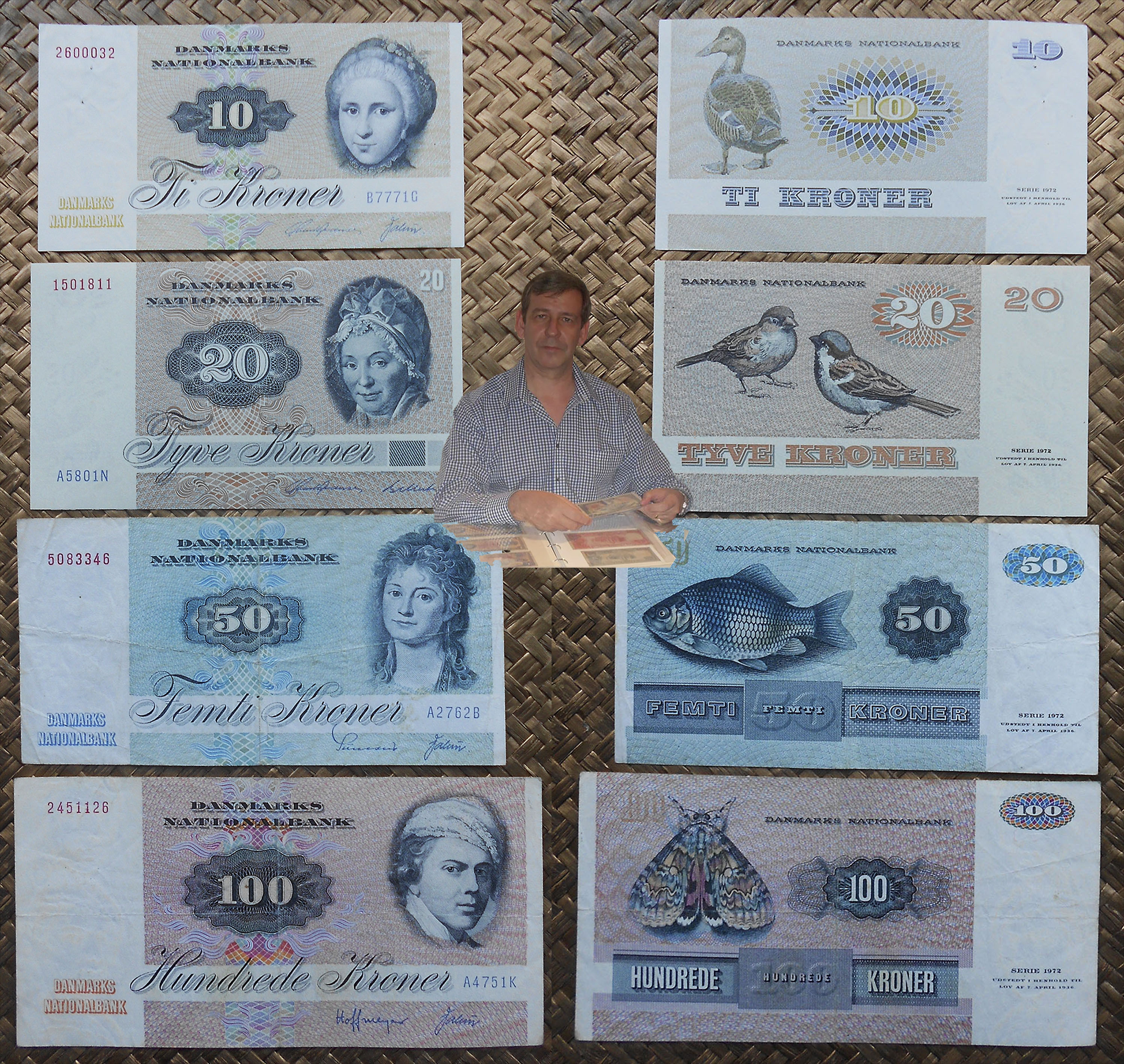 Los ejemplares de la serie de billetes que os presento fueron emitidos por el Danmarks Nationalbank a partir de 1972. Todos sus anversos muestran pinturas del artista danés Jens Juel y en sus reversos animales dibujados por los artistas Ib Andersen, Johannes Larsen y Gunnar Andersen.
