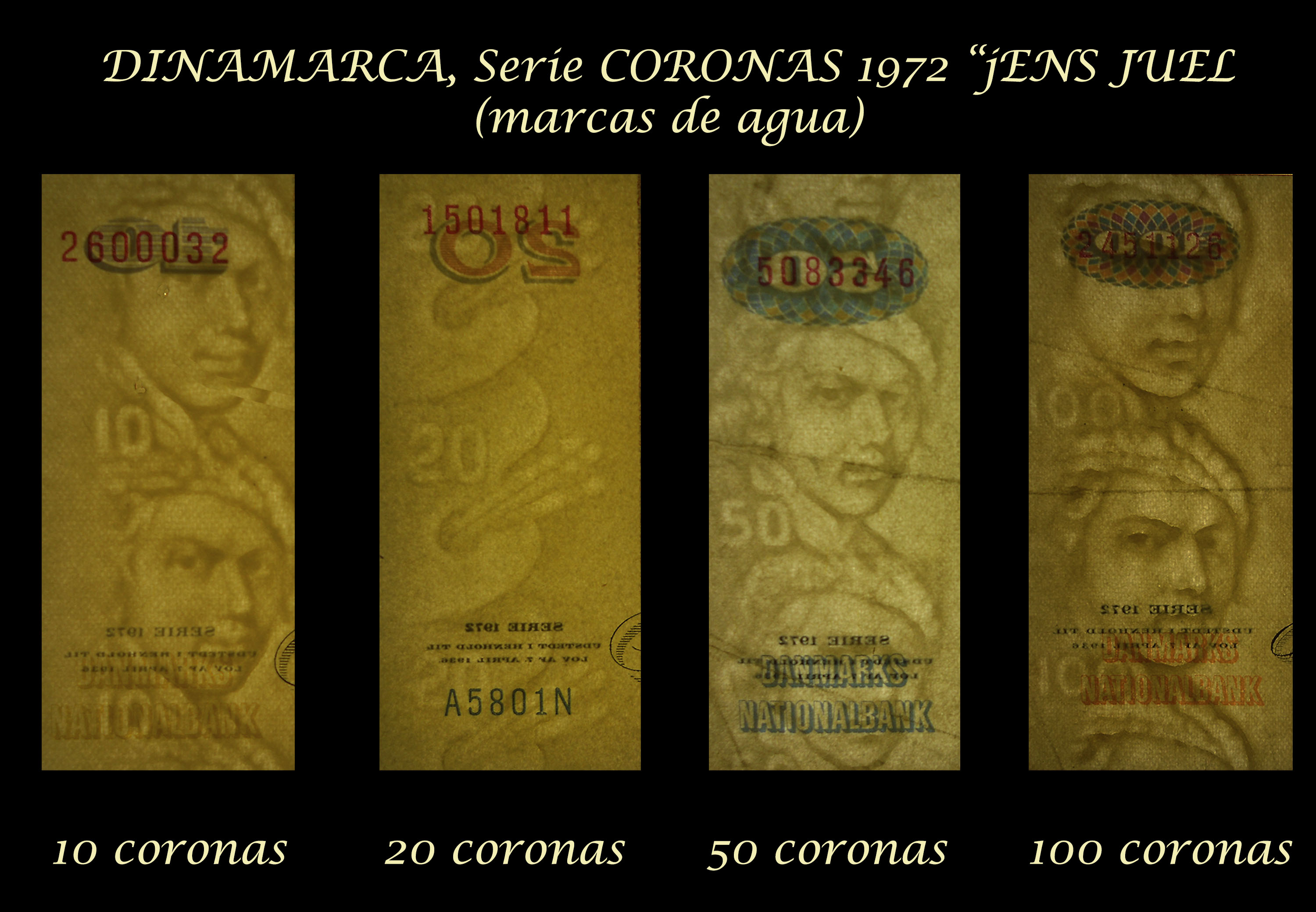 Sus marcas de agua: para los billetes de 10, 50 y 100 coronas, el mismo autorretrato del pintor Jens Juel que nos muestra en el anverso del billete de 100. Para el de 20 coronas una paleta de pintor con pinceles.