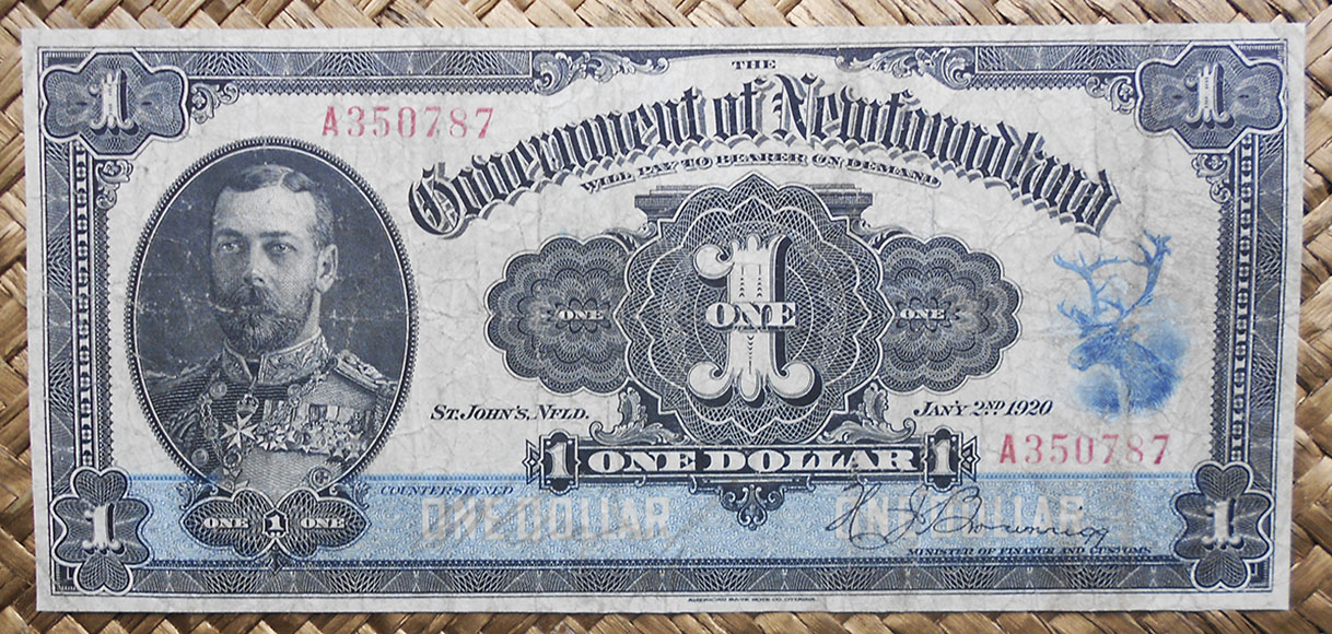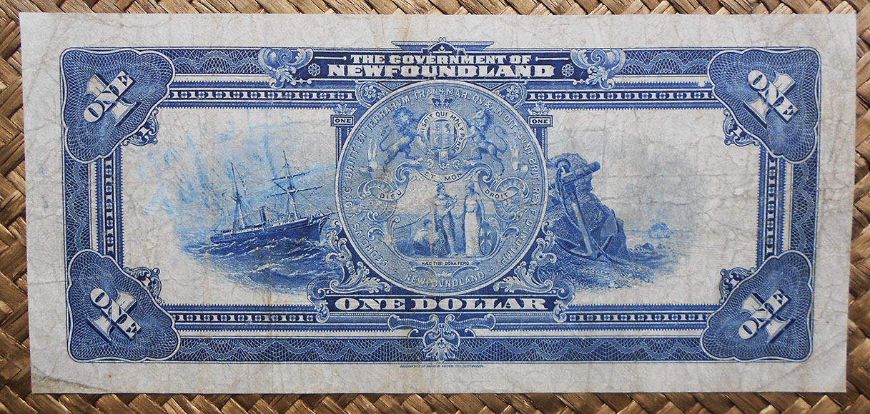 En su anverso aparece el busto uniformado de Jorge V, rey del Reino Unido entre 1910 y 1936, y a la derecha la cabeza de un caribú (reno autóctono de esa fría región). Emitido en Sant John’s, la capital de Terranova, e impreso por la American Bank Note Co. de Ottawa lleva las firmas de Henry J. Brownrigg como Minister of Finance and Customs y manuscrita la de Keating como Countersigned. Textos en inglés y nºs de serie serigrafiados en rojo.