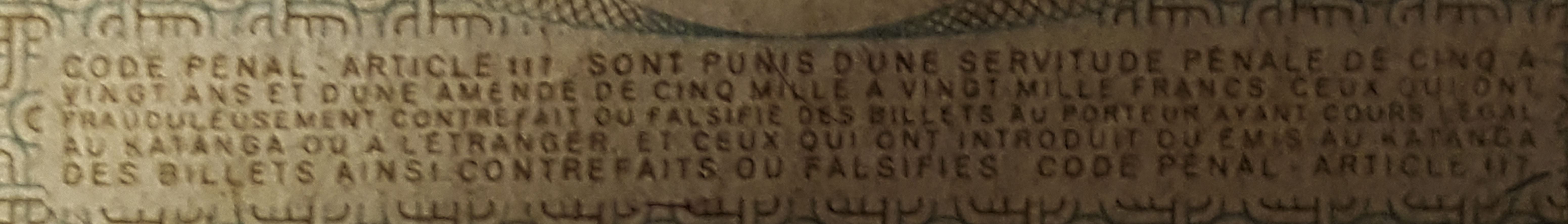 También un cartucho de texto, en el reverso, con una peculiar advertencia, penalizando al falsificador con prisión (de 5 a 20 años) o multa (de 5.000 a 20.000 francos) –Código Penal, art. 177.