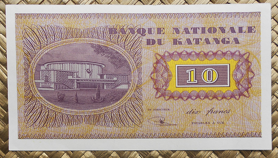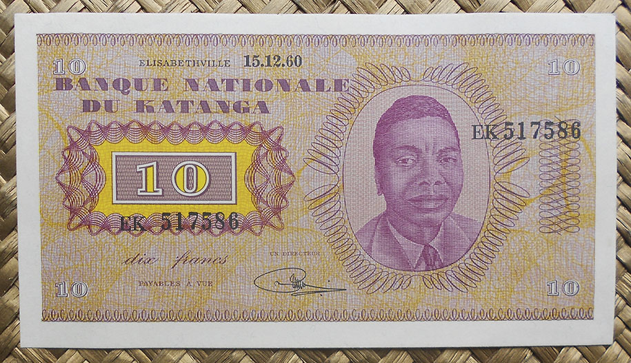 El billete de 10 francos de Katanga de 1960 nos muestra a Moise Tshombe y el edificio del Banco en tonalidades violetas y amarillentas. Los textos en color morado.