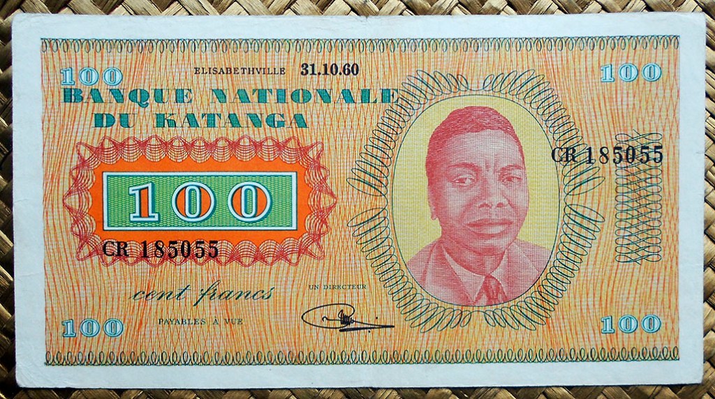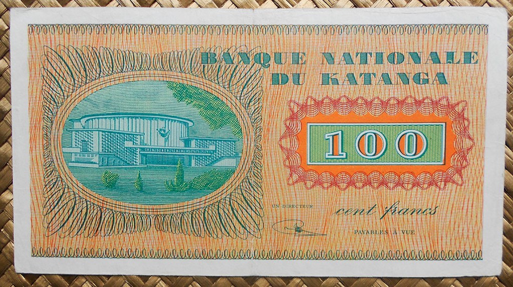 El billete de 100 francos de Katanga de 1960 nos ofrece a Moise Tshombe y el edificio del Banco en tonalidades anaranjadas y verdes respectivamente. Los textos en color verde.