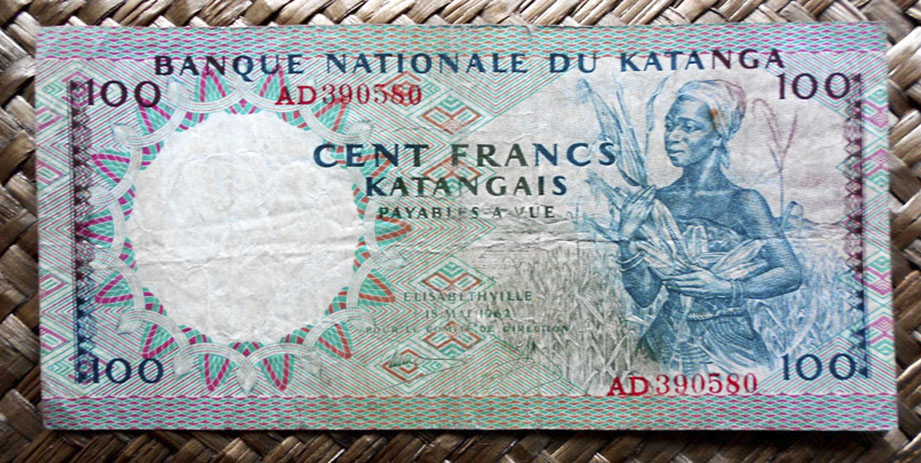 El billete de 100 francos de Katanga de 1962 fue impreso por Jon Enschede en Zonen de Holanda, con mejores seguridades que la edición anterior. Nos muestra una oriunda campesina con mieses del maizal recolectadas. En su reverso una roseta a modo de rueda que muestran vectores radiales formados por lanzas y máscaras rituales. Lleva las firmas impresas de Kitambala y Mwilambwe como miembros del Comité de Dirección del Banco. Los textos en francés, pero con la denominación de la moneda completa “francs katangais” y los números de serie en rojo.