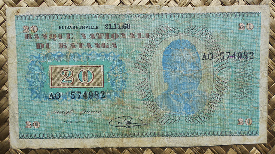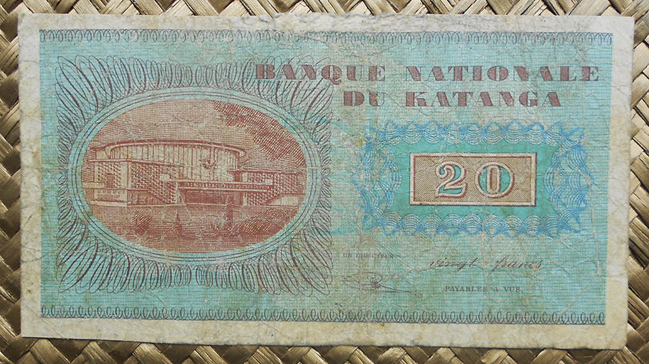 El billete de 20 francos de Katanga de 1960 nos ofrece a Moise Tshombe y el edificio del Banco en tonalidades azules y granates respectivamente. Los textos en color marrón.