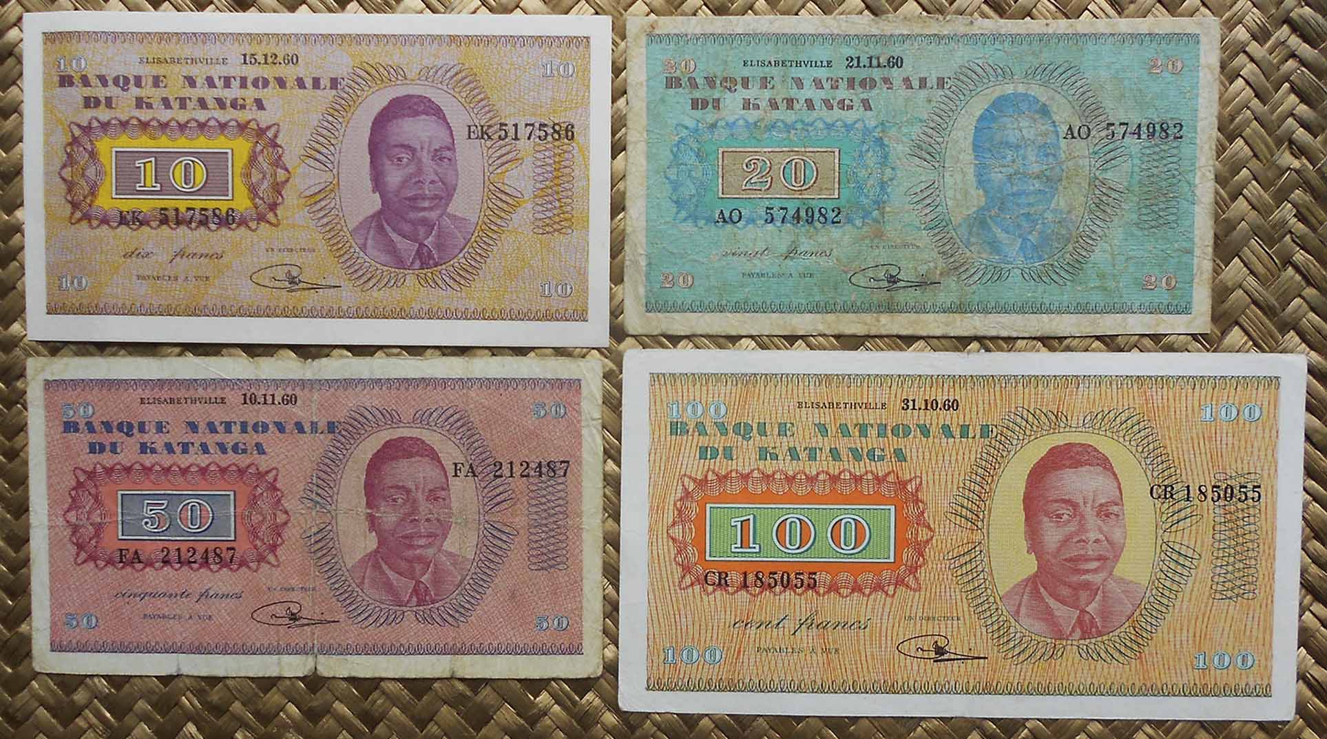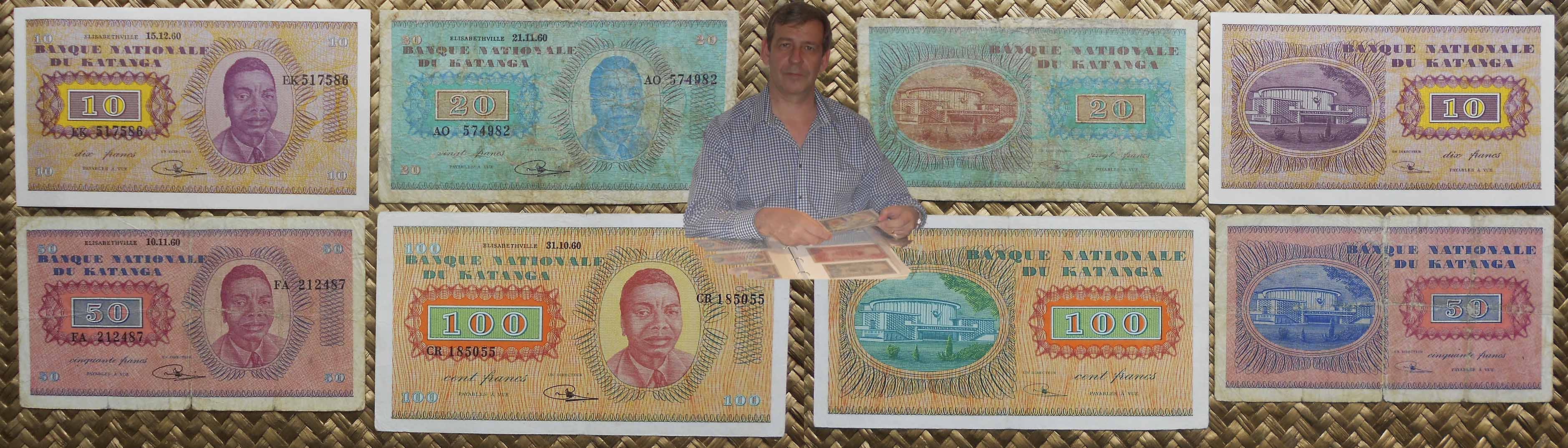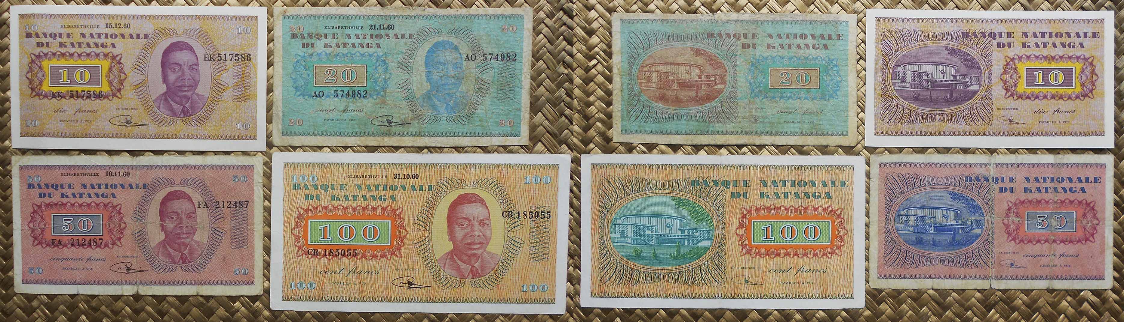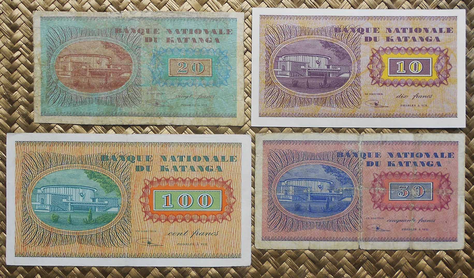 De las dos emisiones billetarias que veríamos en Katanga, del “Banque Nationale du Katanga”, contemplaremos cuatro ejemplares de la primera emisión, en 1960 y un ejemplar de la segunda emisión, en 1961-62. Son los billetes de 10, 20, 50 y 100 francos de 1960 y el billete de 100 francos de 1962.