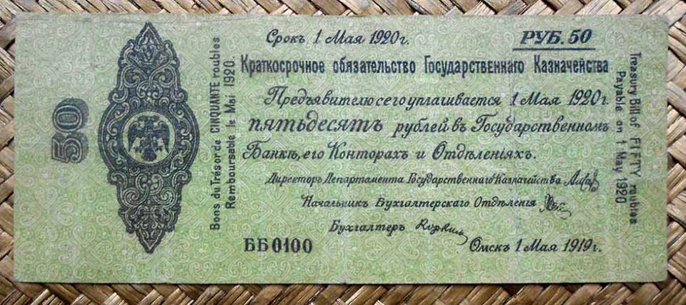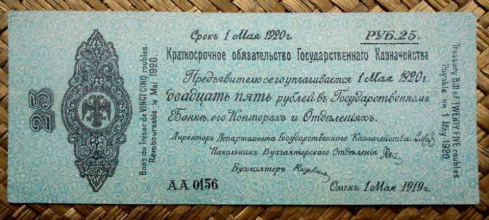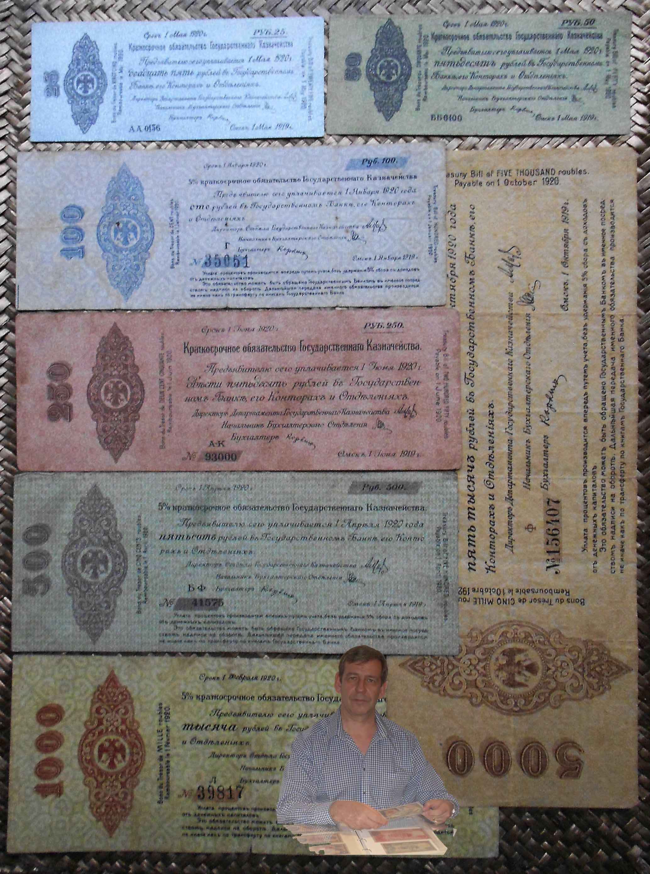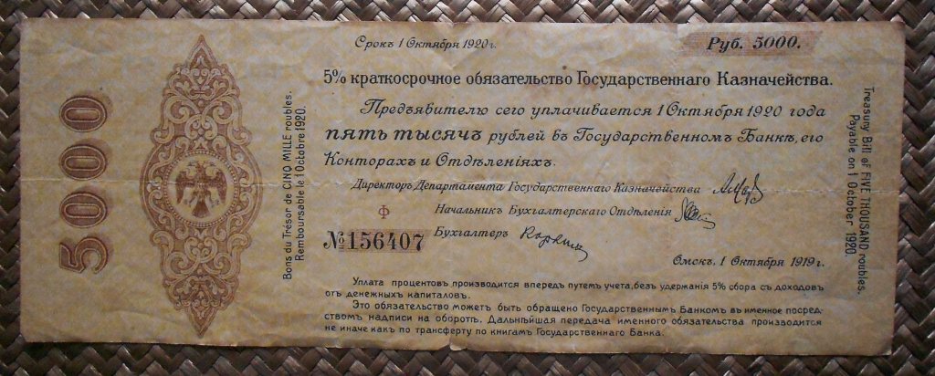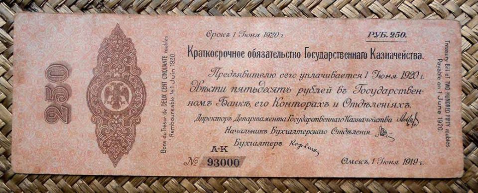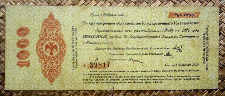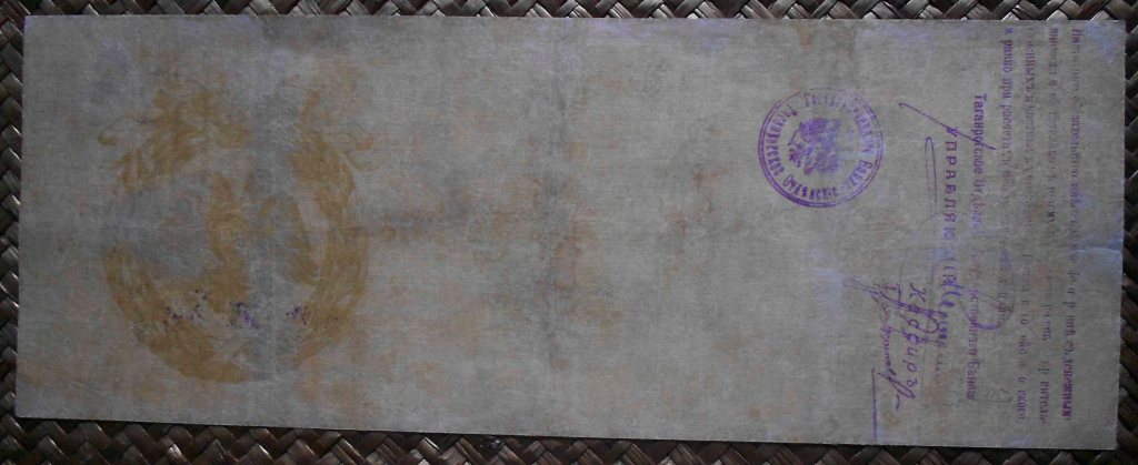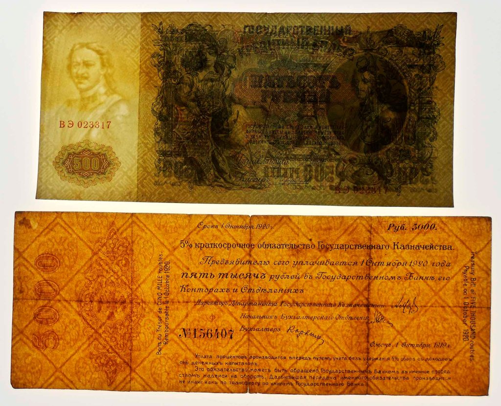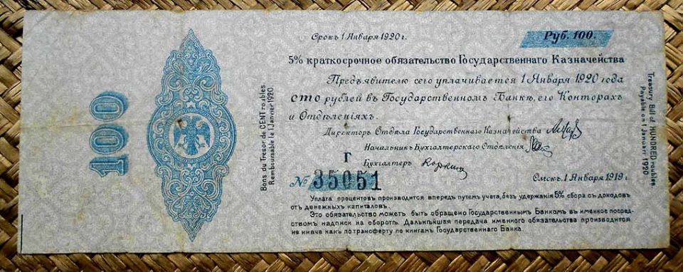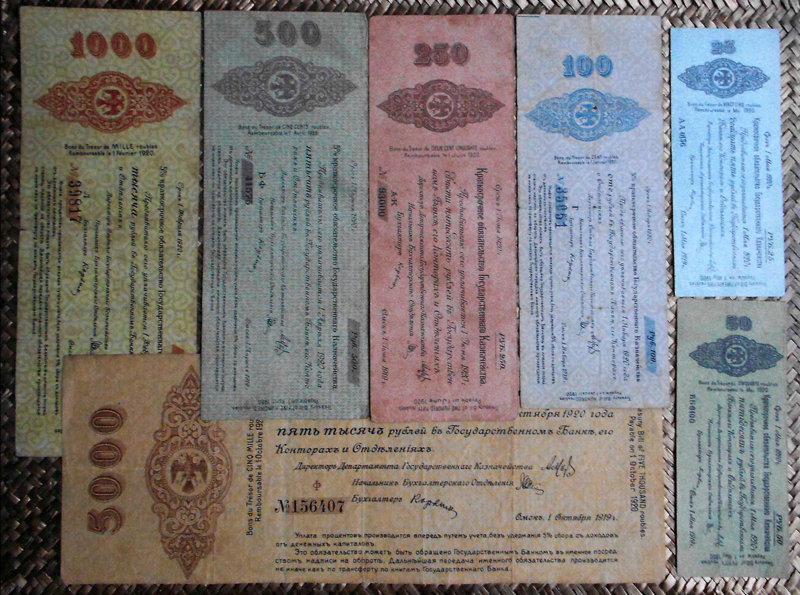 Los bonos granates y azules fueron puestos en circulación en 1920 con un resello de la R.S.F.S.R. Federación de Repúblicas Socialistas Soviéticas (“Russian Soviet Federative Socialist Republic” “Русский Советская Федеративная Социалистическая Республика”); circularían ya desde el Gobierno Bolchevique (Comité Revolucionario de Siberia).