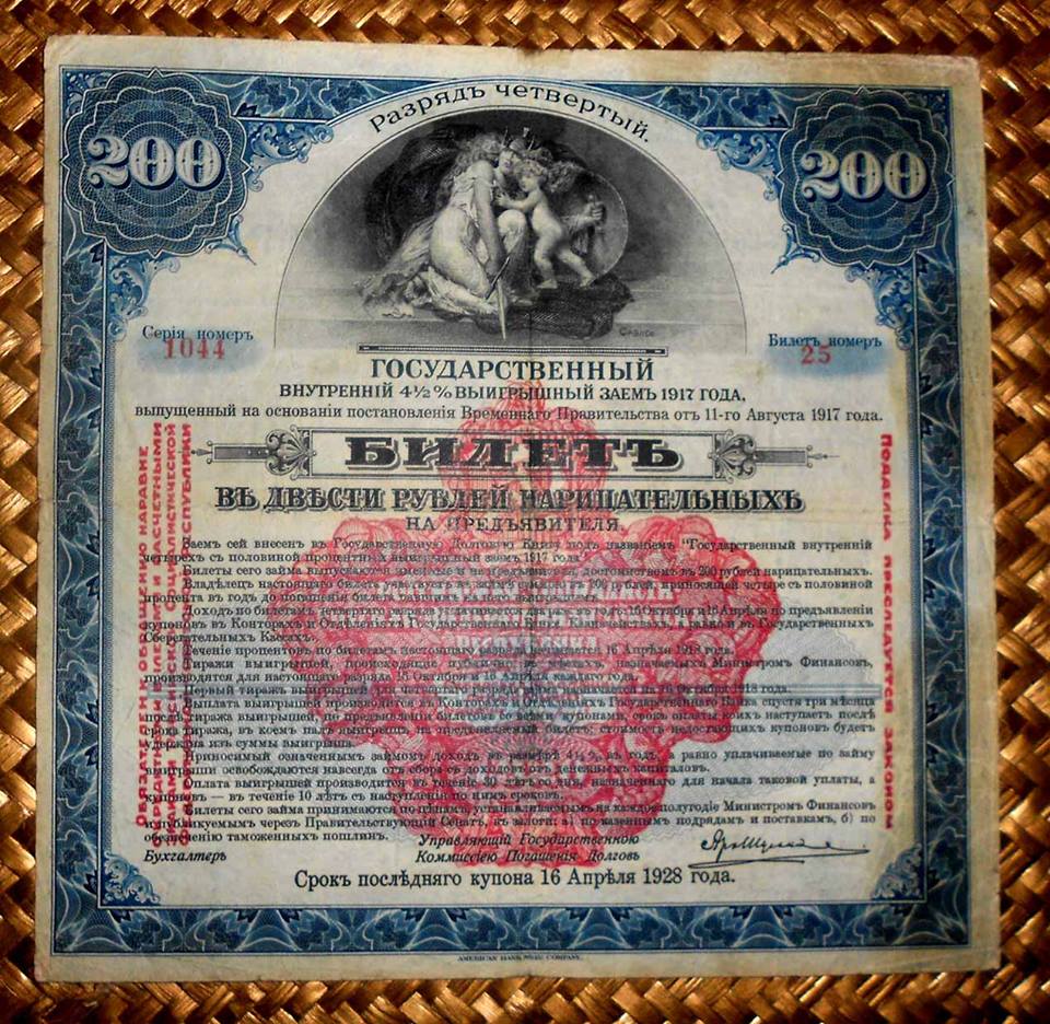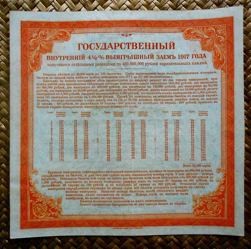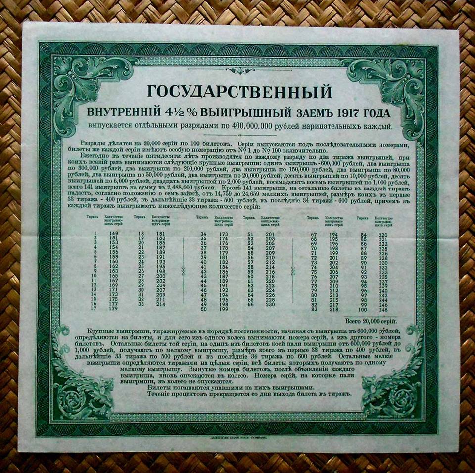 Desde «Rarezas» nos adentramos en Rusia, en plena Revolución, pero 100 años después. La serie que mostramos, dentro del Centenario de la Revolución Rusa, nos presenta los llamados “Kolchak Loan Bonds” o Bonos de Préstamo al 4.5% emitidos por la Lotería estatal para financiación del Almirante Kolchak en la Siberia de los inicios de la Revolución Rusa.