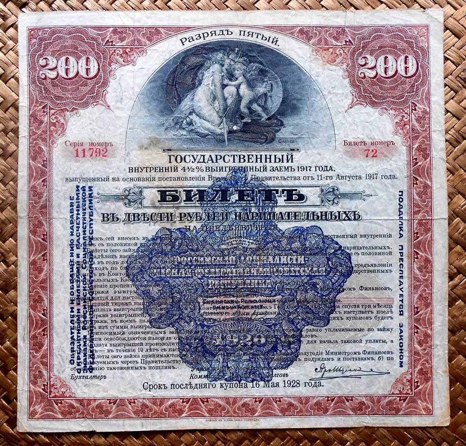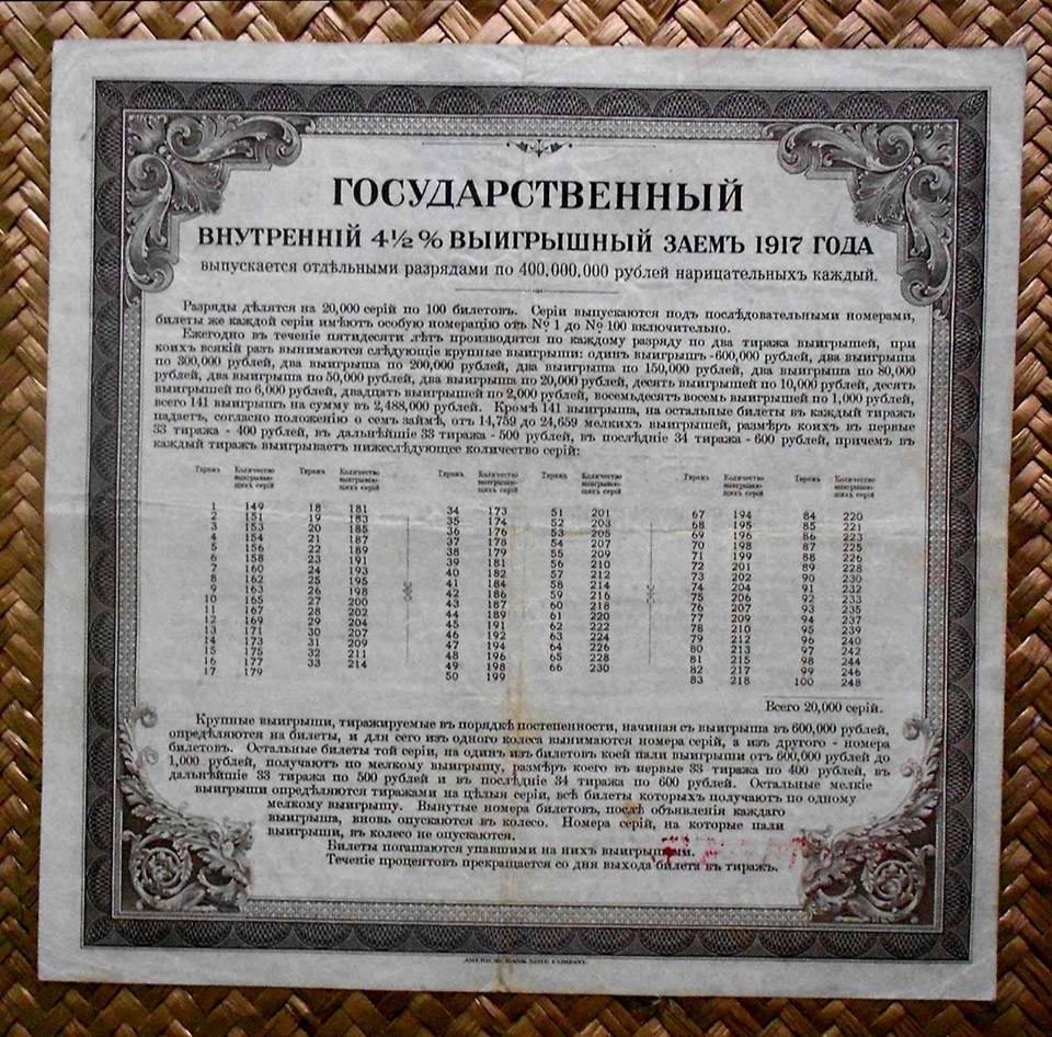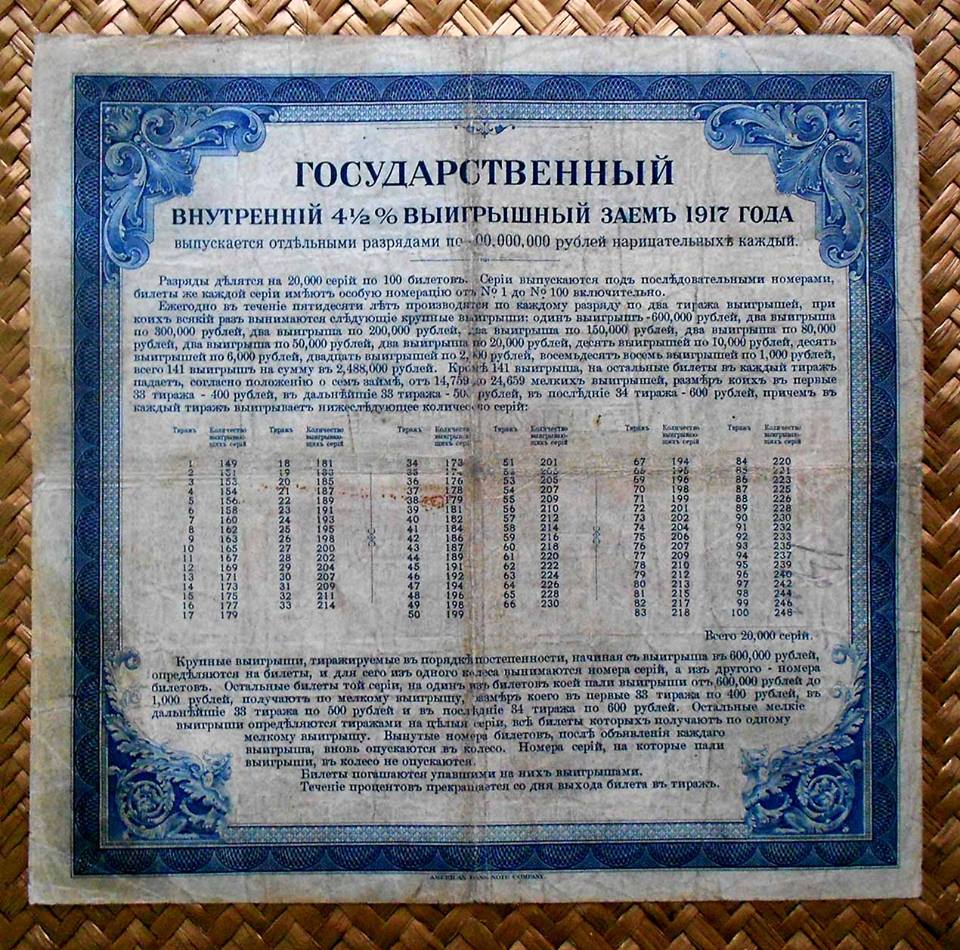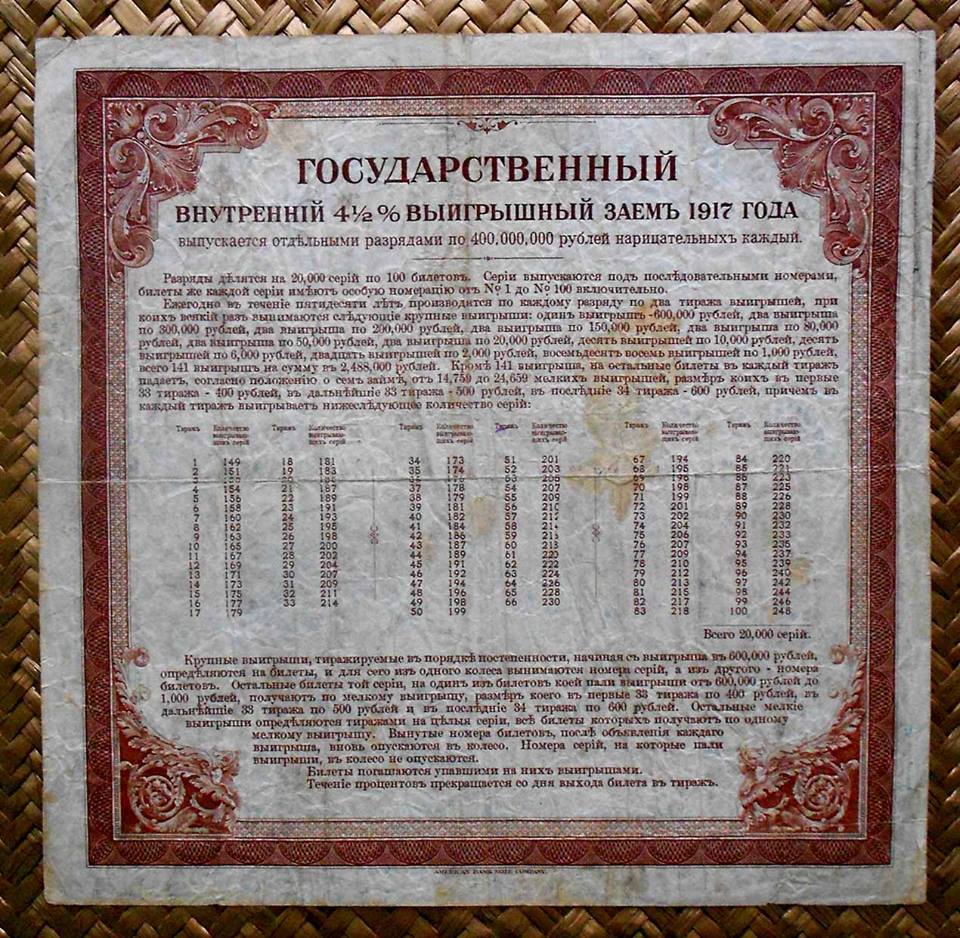 Desde «Rarezas» nos adentramos en Rusia, en plena Revolución, pero 100 años después. La serie que mostramos, dentro del Centenario de la Revolución Rusa, nos presenta los llamados “Kolchak Loan Bonds” o Bonos de Préstamo al 4.5% emitidos por la Lotería estatal para financiación del Almirante Kolchak en la Siberia de los inicios de la Revolución Rusa.