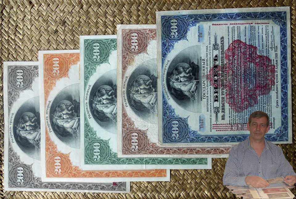 Contemplamos el bono verde de 200 rublos de 1919, el bono marrón de 1919, el bono naranja de 1919, el bono granate con sello azul de 1920 y el bono azul con sello rojo de 1920. Impresos por la American Bank Note Company en 1917 y firmados por S.A. Uget (agregado financiero de la Embajada rusa en Washington), se emitieron 10 millones de bonos de 200 rublos divididos en cinco ediciones distintas.