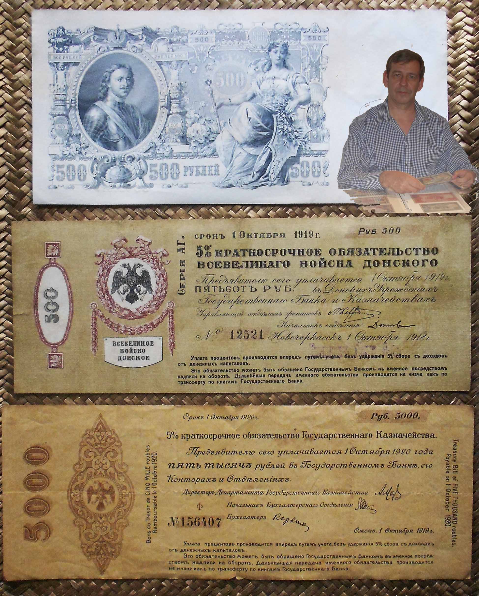 Los bonos granates y azules fueron puestos en circulación en 1920 con un resello de la R.S.F.S.R. Federación de Repúblicas Socialistas Soviéticas (“Russian Soviet Federative Socialist Republic” “Русский Советская Федеративная Социалистическая Республика”); circularían ya desde el Gobierno Bolchevique (Comité Revolucionario de Siberia).