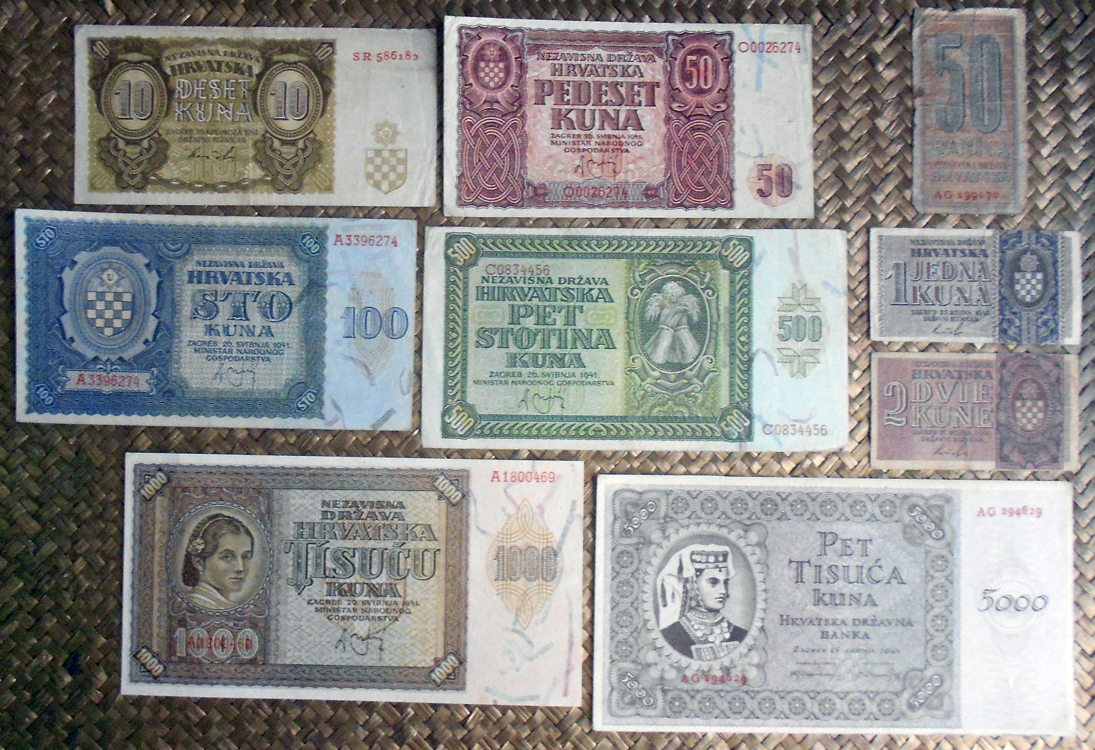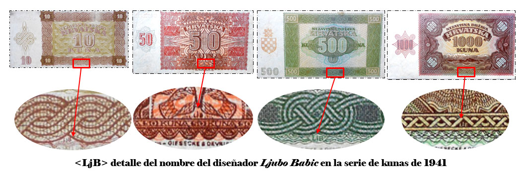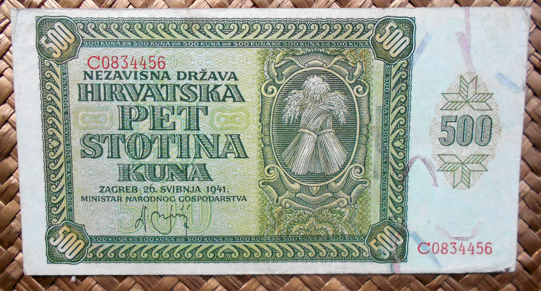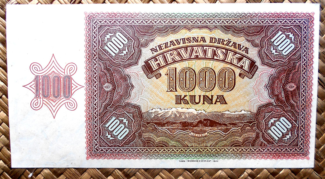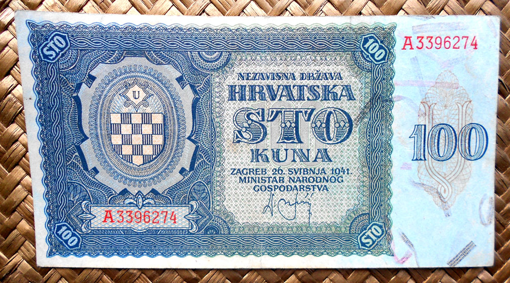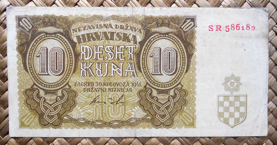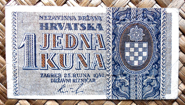 El Nezaviska Drzava Hrvatska introdujo en 1941 una primera serie de valores de 10, 50, 100, 500 y 1000 kunas diseñados por Ljubo Babic.