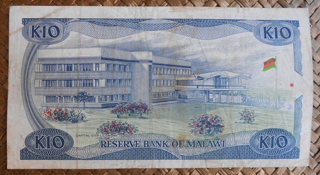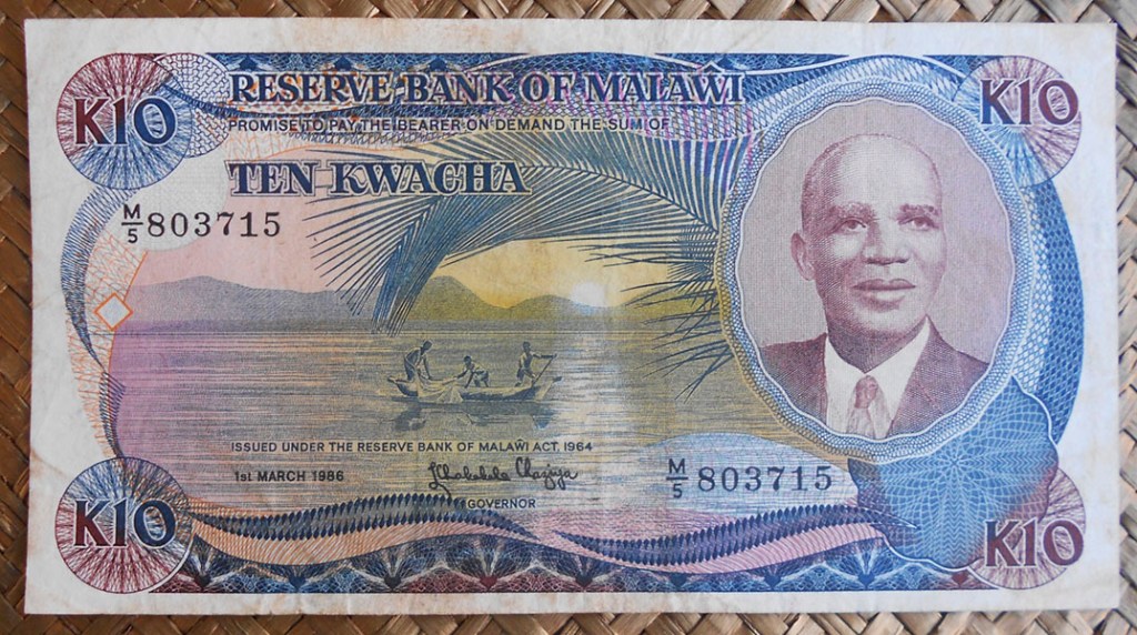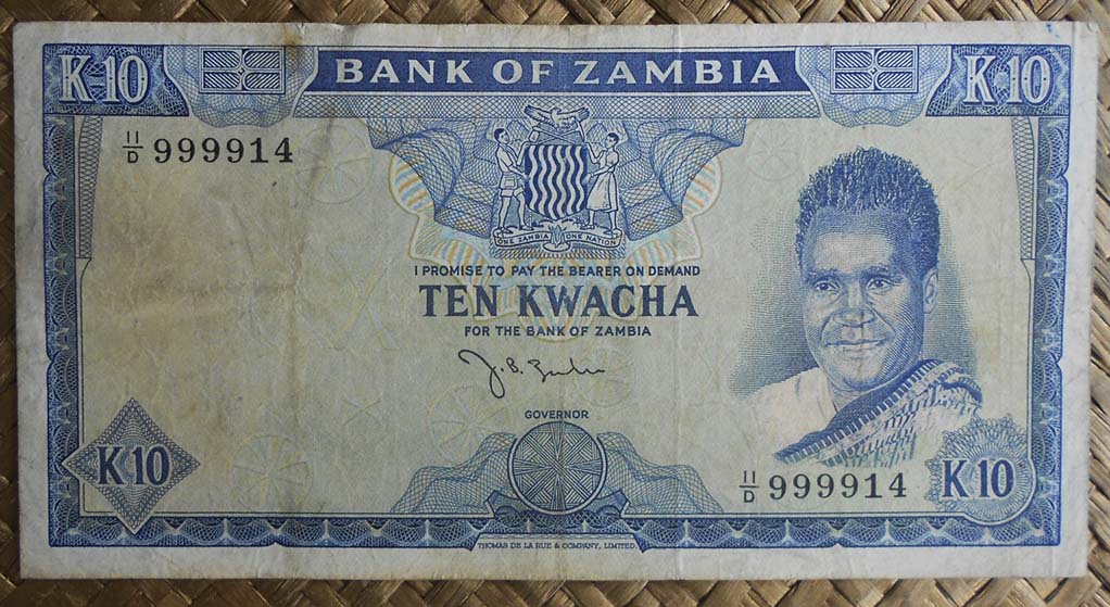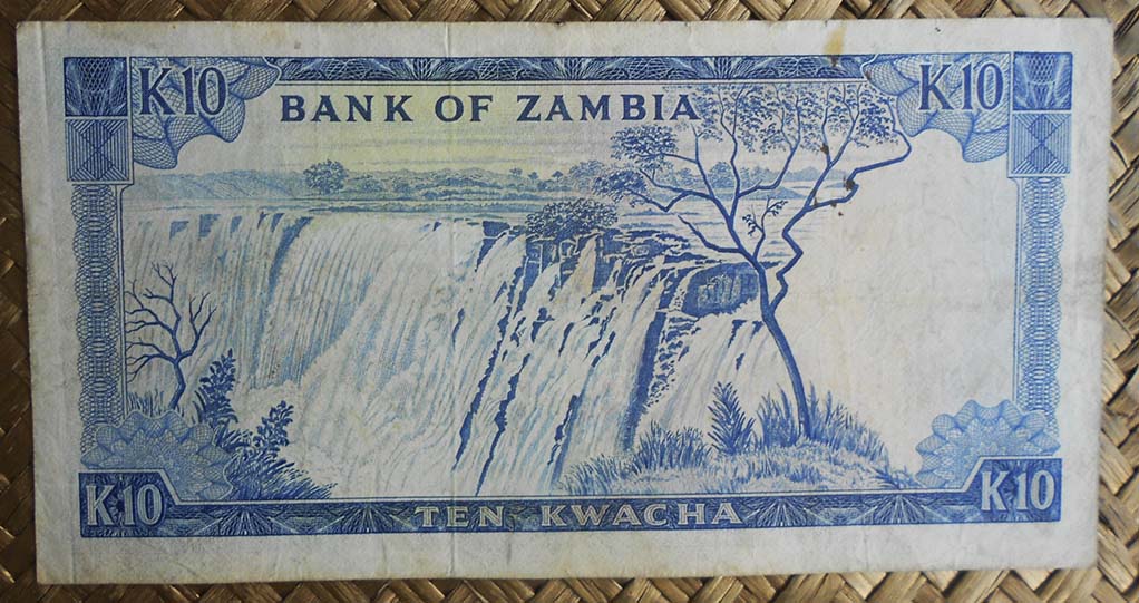 El billete de 10 kwachas de Zambia de 1969 nos ofrece al anverso al Presidente Kaunda en cromaticidad azulada. Para el reverso las cataratas Victoria del río Zambeze. El nombre de Zambia tiene su raíz en este río, uno de los más importantes del África austral. Lleva la firma de J. B. Zulu como Governor.