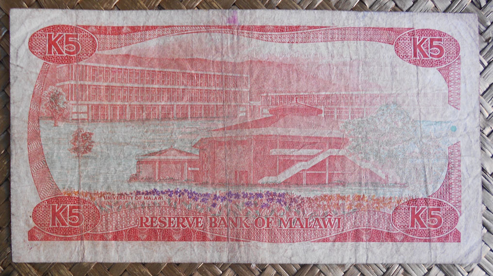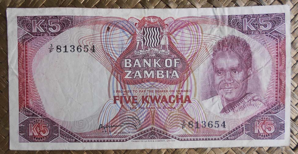 El billete de 5 kwachas de Zambia de 1973 nos muestra al anverso al Presidente Kaunda en cromaticidad rosa púrpura. Para el reverso nos ofrece en primer plano niños en clase de dibujo y de fondo el edificio escolar. Lleva la firma de B. R. Kuwani como Governor.