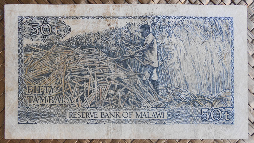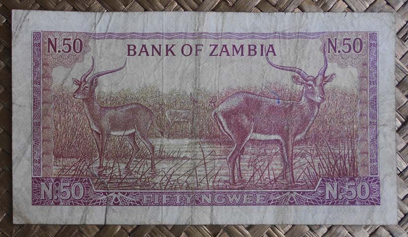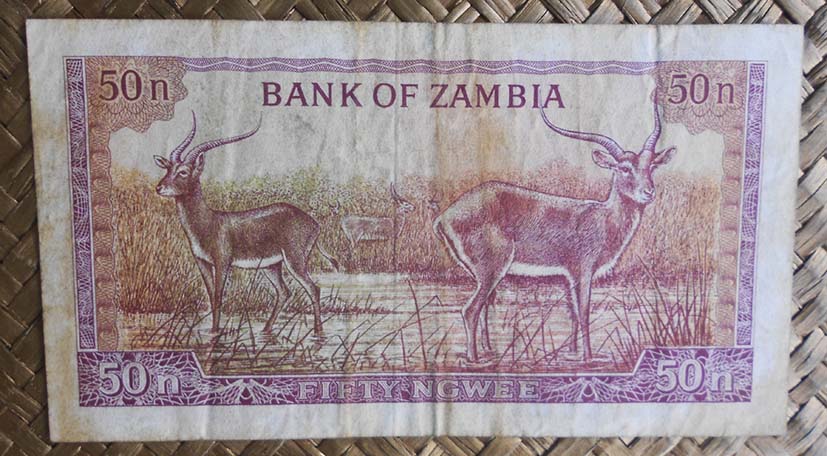 El billete de 50 ngwee de Zambia de 1968 nos muestra al anverso al Presidente Kaunda en cromaticidad rosácea. Para el reverso nos guarda la imagen de dos antílopes africanos (lechwe rojo) en la zona de lagos conocida como Kafue Flats en la provincia de Lusaka. Esta edición nos muestra el valor del billete en nº precedido de su moneda en letra mayúscula y separados por un punto (N.50). Lleva la firma de J. B. Zulu como Governor.