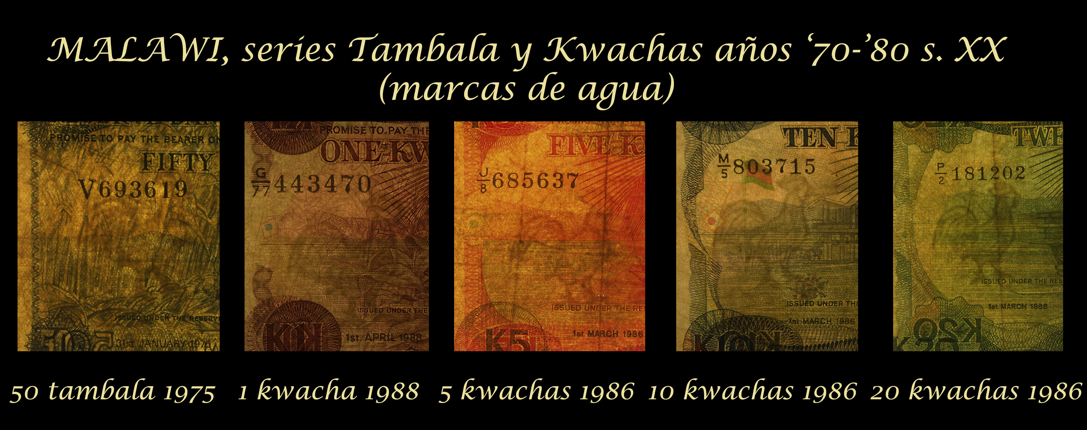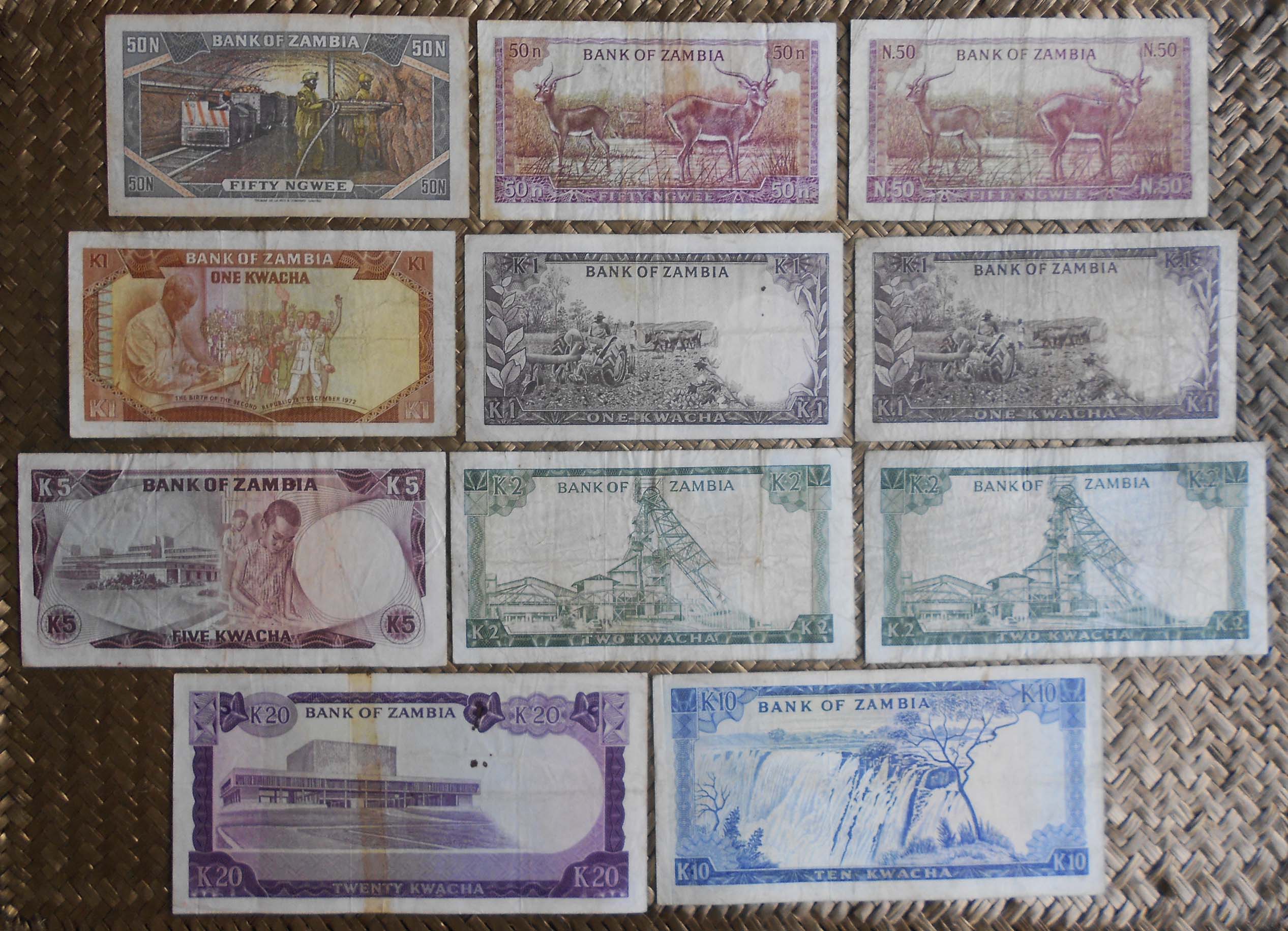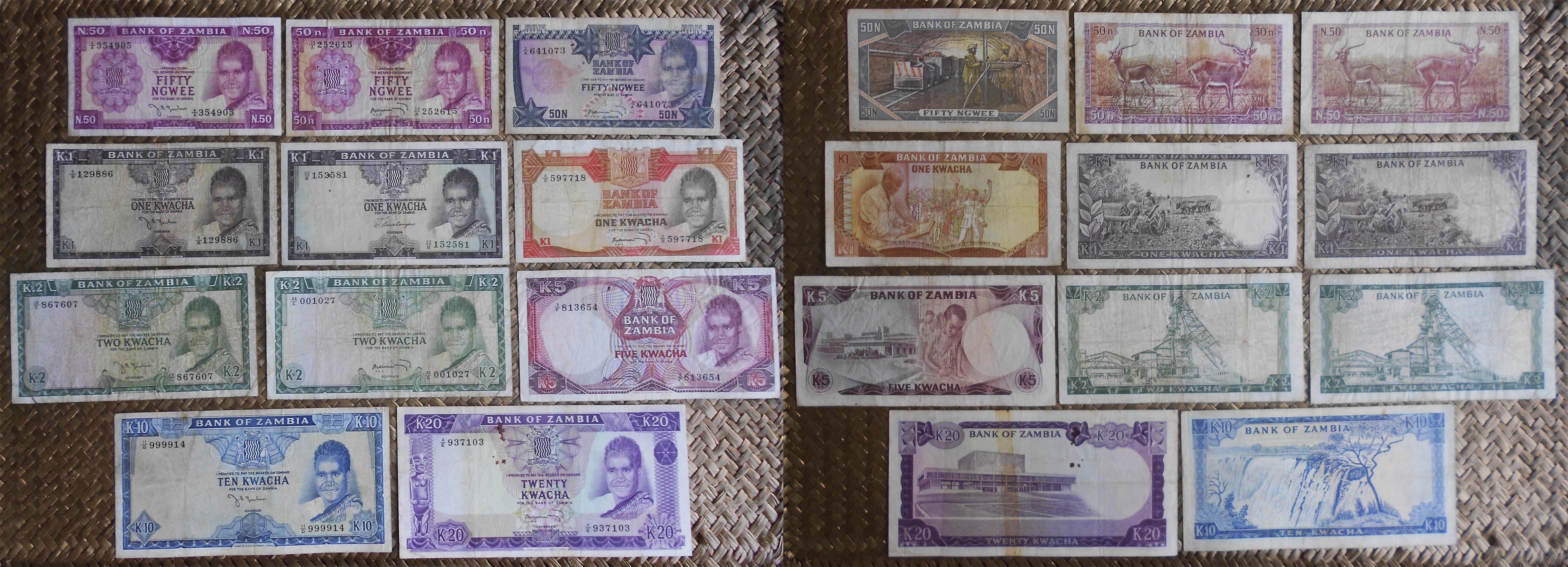 Vamos a contemplar una buena selección de estas tres ediciones pioneras de la nueva moneda zambiana. Revisaremos los billetes de Zambia de 50 ngwee de 1968, 1969 y 1973, de 1 kwacha de 1968, 1969 y 1973, de 2 kwachas de 1968 y 1969, de 5 kwachas de 1973, de 10 kwachas de 1969 y de 20 kwachas de 1969.