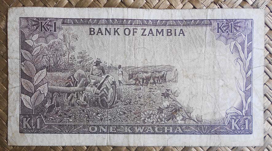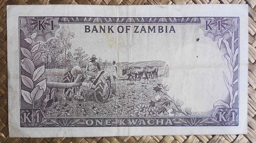 El billete de 1 kwacha de Zambia de 1968 nos muestra al anverso al Presidente Kaunda en cromaticidad marrón. Para el reverso nos guarda la imagen de agricultores en un tractor y conduciendo bueyes. Esta edición nos muestra el valor del billete en nº precedido de su moneda en letra mayúscula y separados por un punto (K.1). Lleva la firma de J. B. Zulu como Governor.