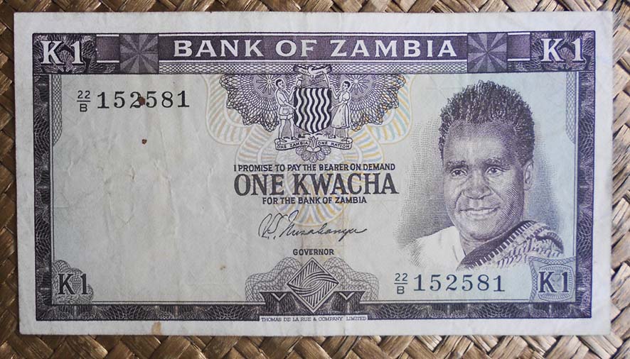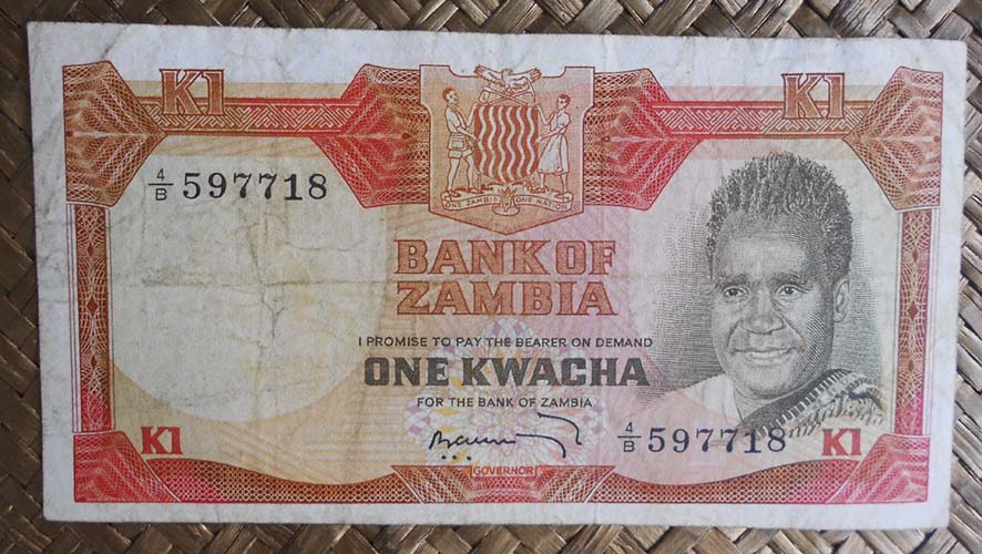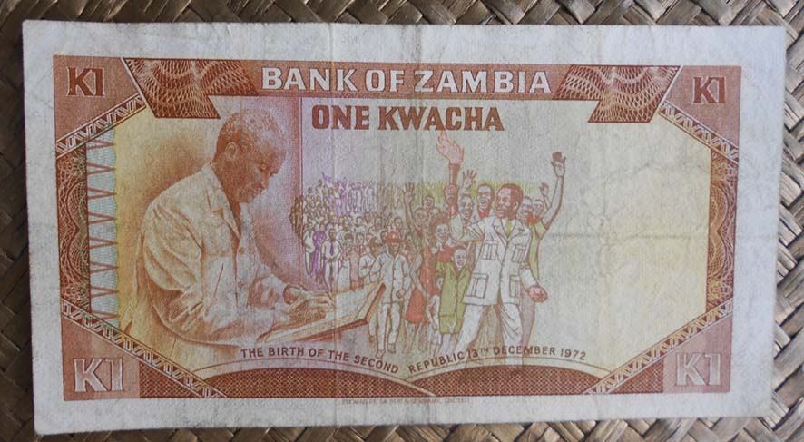 El billete de 1 kwacha de Zambia de 1973 nos muestra al anverso al Presidente Kaunda en cromaticidad grisácea con marco anaranjado. Para el reverso nos ofrece en primer plano al presidente sobre un atril y de fondo una multitud en la manifestación de conmemoración del Nacimiento de la 2ª República el 13 de Diciembre de 1972. Lleva la firma de B. R. Kuwani como Governor.