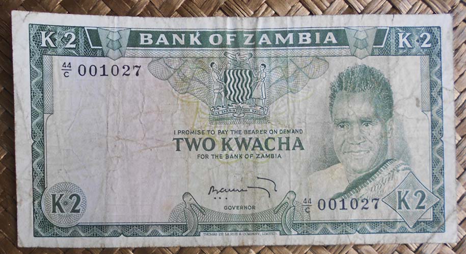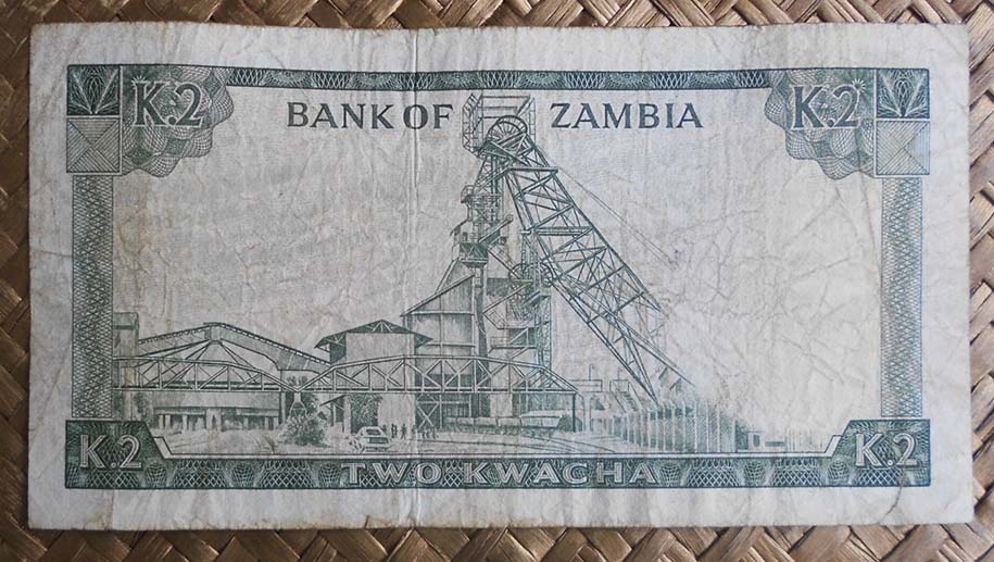 El billete de 2 kwachas de Zambia de 1968 nos muestra al anverso al Presidente Kaunda en cromaticidad verde. Para el reverso nos guarda la vista de una factoría minera de cobre, con su torre y cinta transportadora. Esta edición nos muestra el valor del billete en nº precedido de su moneda en letra mayúscula y separados por un punto (K.2). Lleva la firma de J. B. Zulu como Governor.