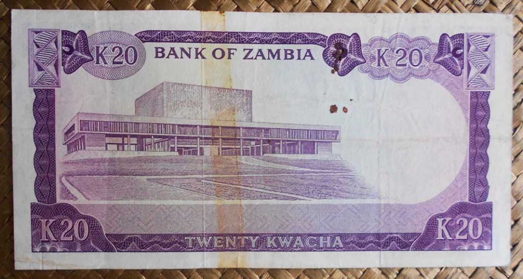 El billete de 20 kwachas de Zambia de 1969 nos ofrece al anverso al Presidente Kaunda en cromaticidad violeta. Para el reverso el edificio de la Asamblea Nacional en Lusaka. Lleva la firma de B. R. Kuwani como Governor.