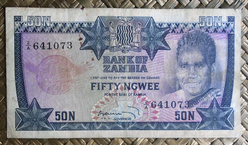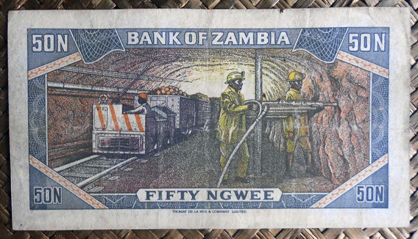 El billete de 50 ngwee de Zambia de 1973 nos muestra al anverso al Presidente Kaunda en cromaticidad gris azulada. A su izquierda un disco rosáceo simulando el sol atravesado por un águila africana. Para el reverso nos ofrece la imagen de unos mineros en una mina subterránea de cobre. Esta edición nos muestra el valor del billete en nº con su moneda en letra mayúscula sin punto de separación (50N). Lleva la firma de B. R. Kuwani como Governor.
