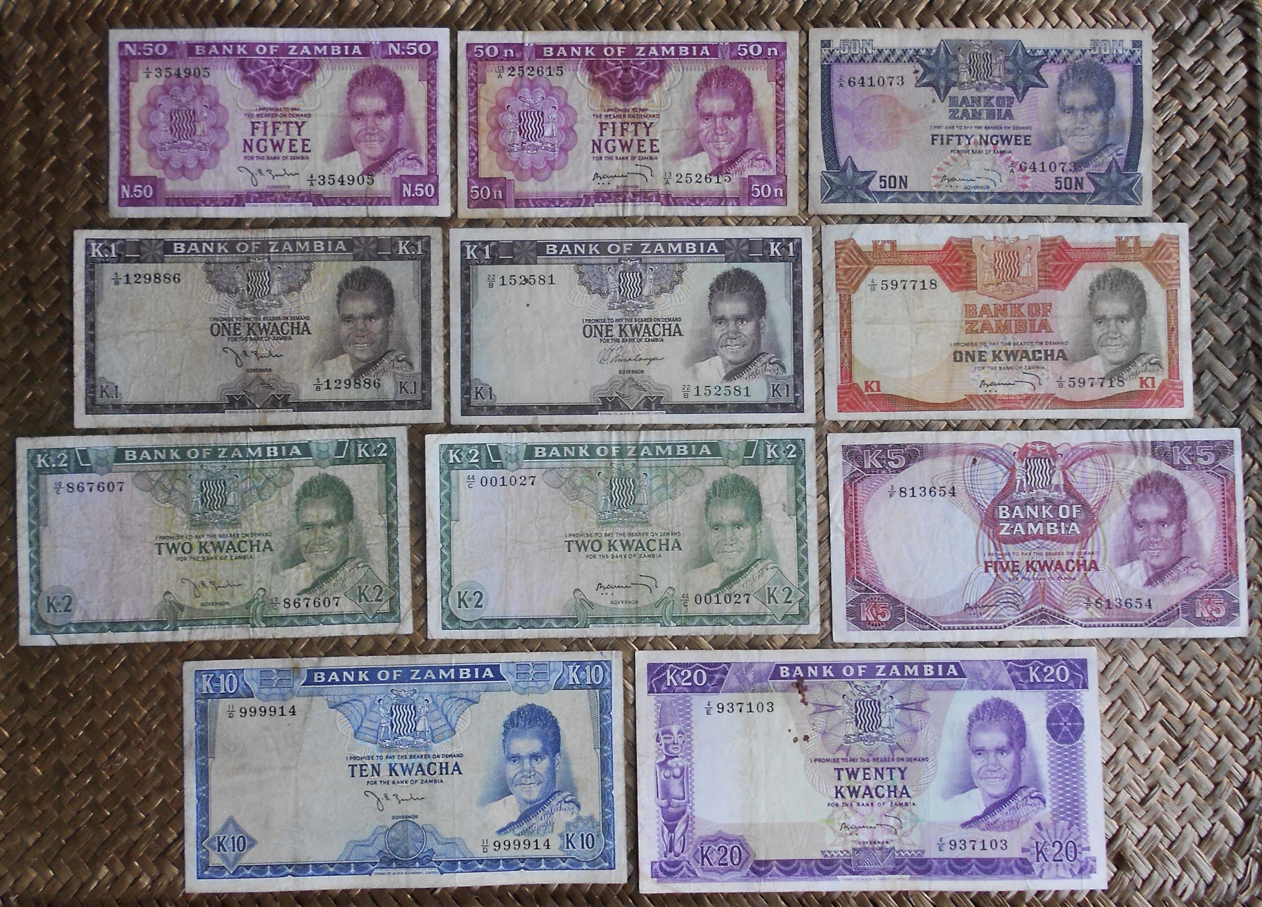 Desde su independencia, y tras un corto periodo de circulación de libras (pounds) y chelines (shillings), marca del colonizador, se emitío la nueva moneda zambiana con el nombre de kwacha (y ngwee para los céntimos) y con una paridad de 1 kwacha = 100 ngwee = 10 shillings = ½ pound. Se emitió por primera vez en 1968, viendo dos emisiones más en apenas 5 años, la segunda en 1969 y la tercera en 1973.