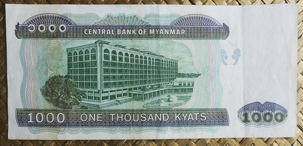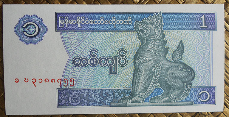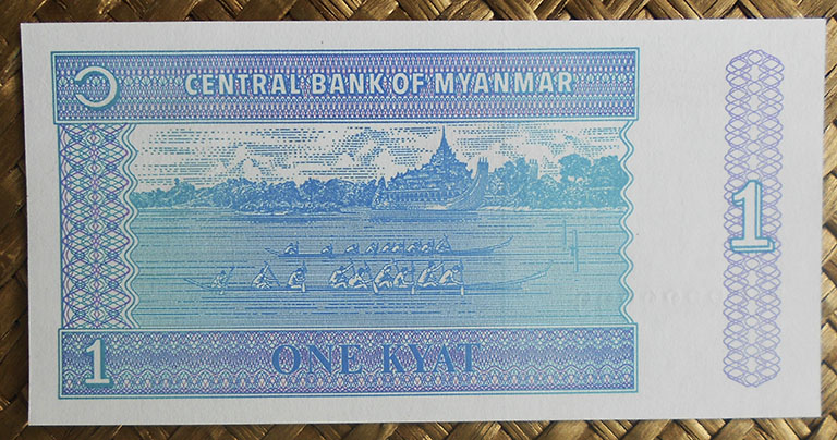El billete de 1 kyat de Birmania de 1958, en tonalidad verde grisáceas, muestra su anverso presidido por Aung San; para el reverso ofrece un paisaje fluvial con barcos de vela entre montañas y el horizonte, junto a un medallón de círculos concéntricos con distintos cicloides, hojas y flores; corona el valor del billete el texto “ONE KYAT”.