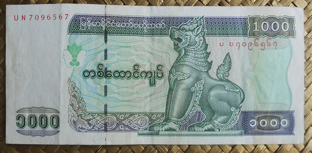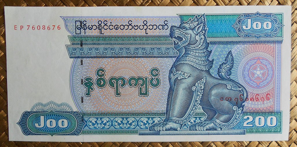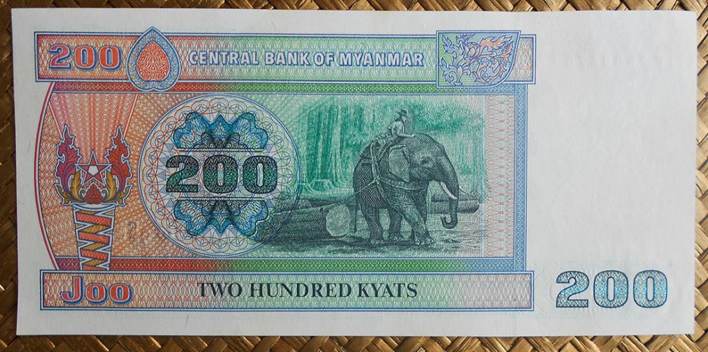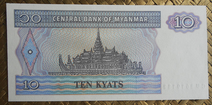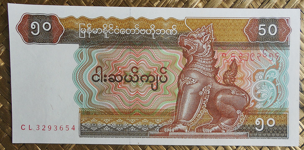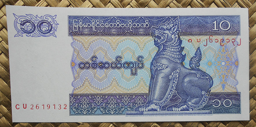 Para el billete de 10 kyats de Birmania de 1958, en tonos azules y crema, vemos a Aung San en anverso y al pie central de este lado la cabeza de un león mitológico dentro de un círculo; para su reverso se nos muestra un elefante levantando un tronco de madera teca (autóctona del sureste asiático) en un paisaje boscoso.
