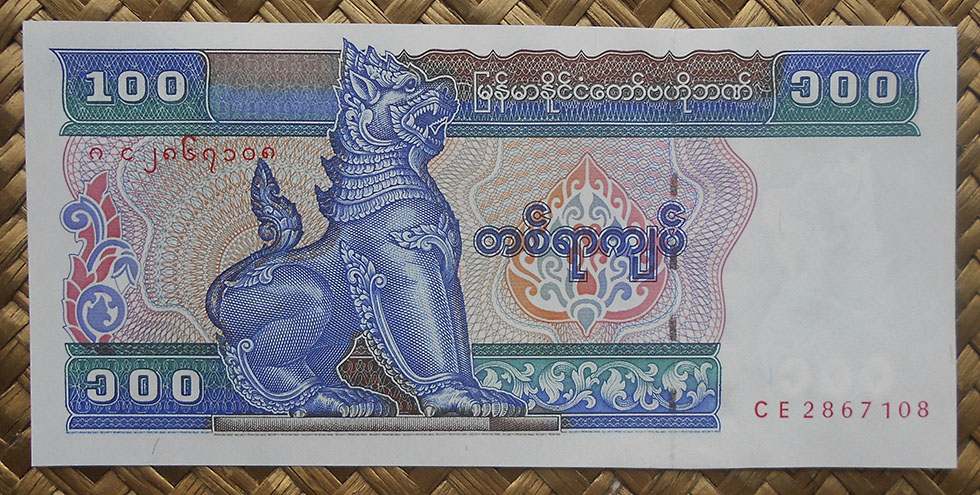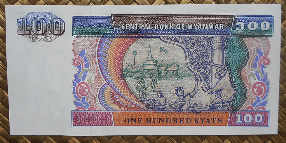 Solo el anverso del billete de 100 kyats nos muestra a gran extensión el pavo real con las alas extendidas que fue el emblema nacional en la época de la colonia británica. Arabescos, guilloches y motivos florales completan la composición.Textos en birmano en el anverso y en inglés en el reverso. Números en birmano y occidentales en ambos lados. Fueron impresos por Thomas de la Rue & Co. de Londres.