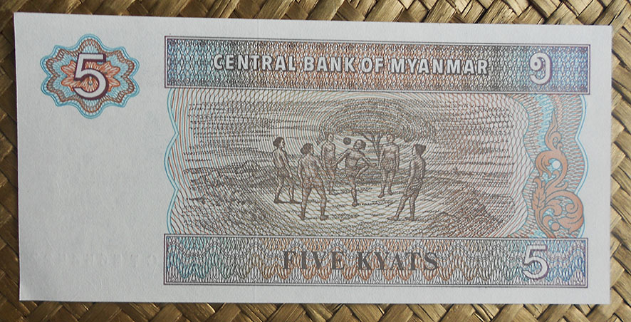 El billete de 5 kyats de Birmania de 1958, de tonalidad amarronada y anverso mostrando a Aung San, nos ofrece en su reverso un dibujo de una joven hilandera moviendo una rueca de algodón y al fondo su maestra tejiendo en un telar.