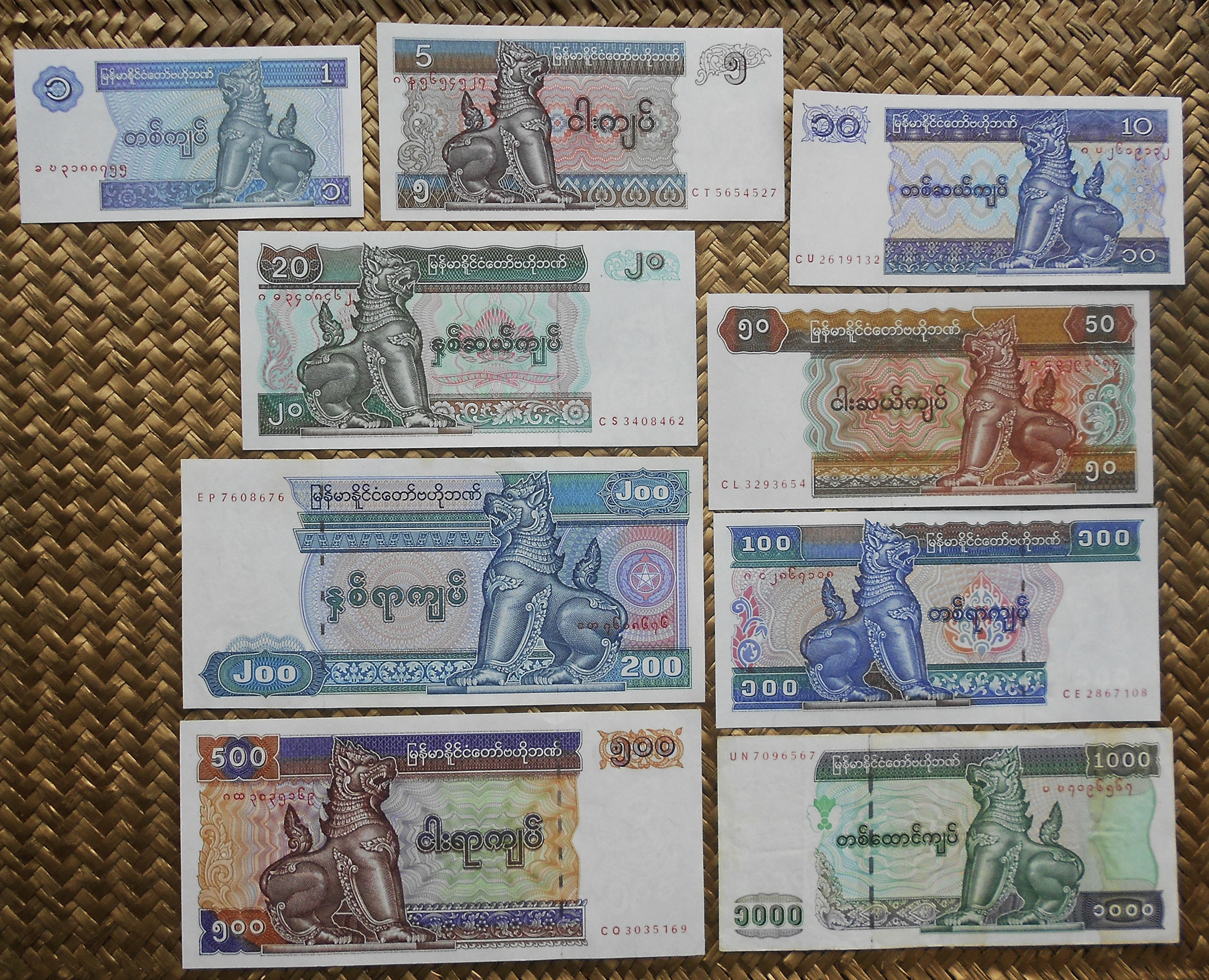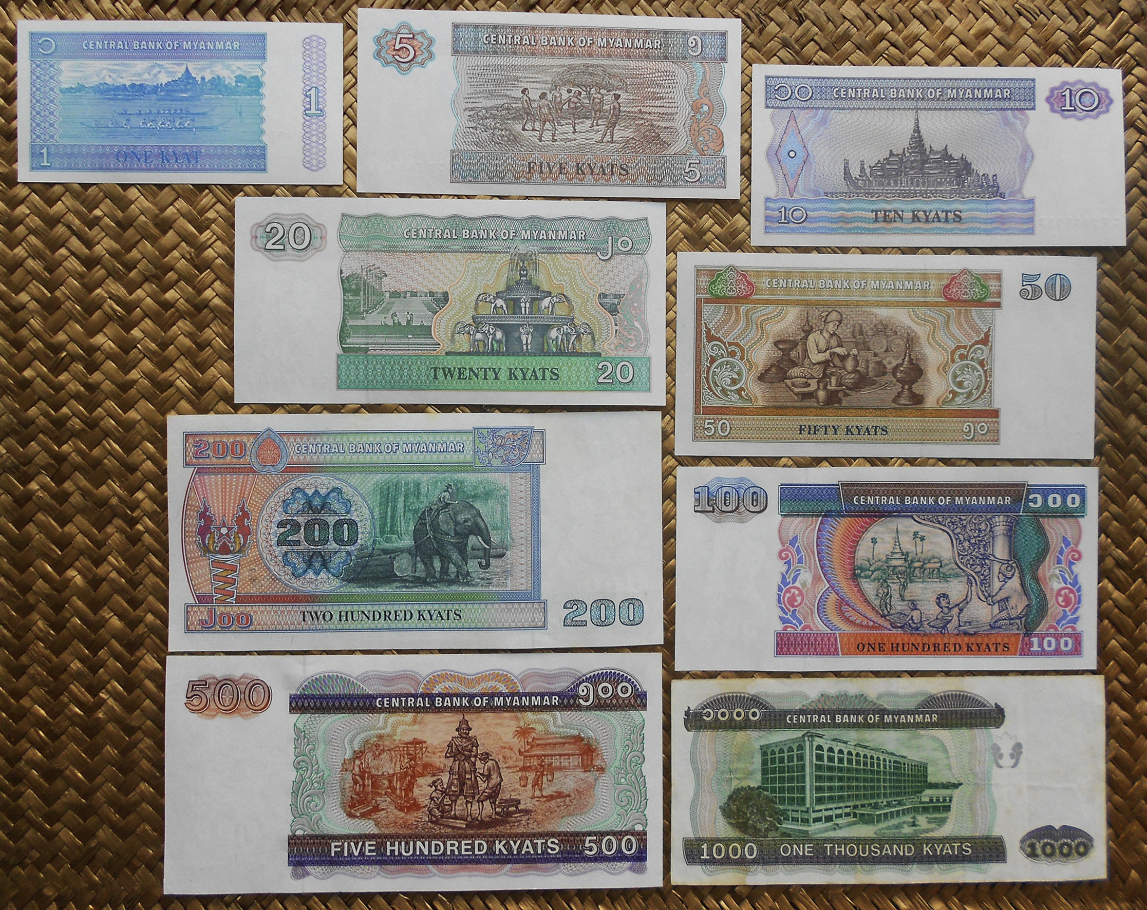 Repasamos los billetes de 1 kyat, 5 kyats, 10 kyats, 20 kyats, 50 kyats y 100 kyats de Birmania de 1958.