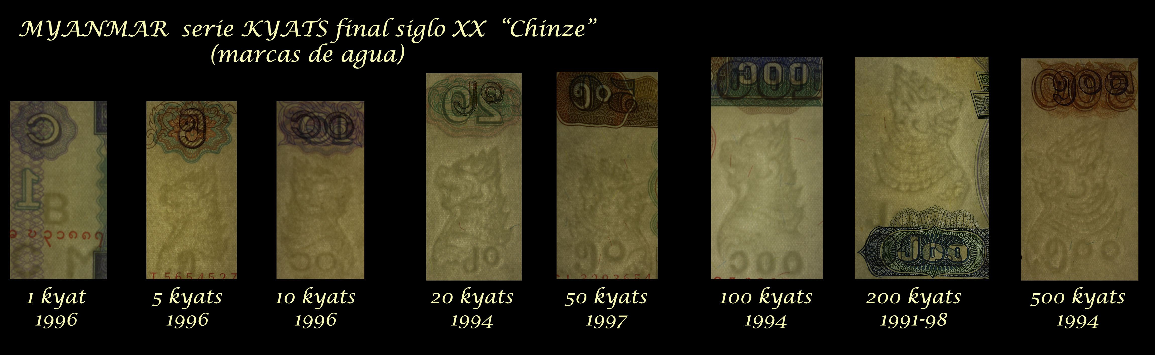 Para el anecdotario notafílico: esta serie de 1958 fue precedida de la primera serie de kyats (de 1953) con los mismos grabados y composiciones que la contemplada, salvo una diferencia muy de “culto al líder”: la imagen del general Aung San (tanto en anversos como en filigrana) había sustituido a la imagen del pavo real –símbolo colonial británico (en anversos y también en la marca de agua).