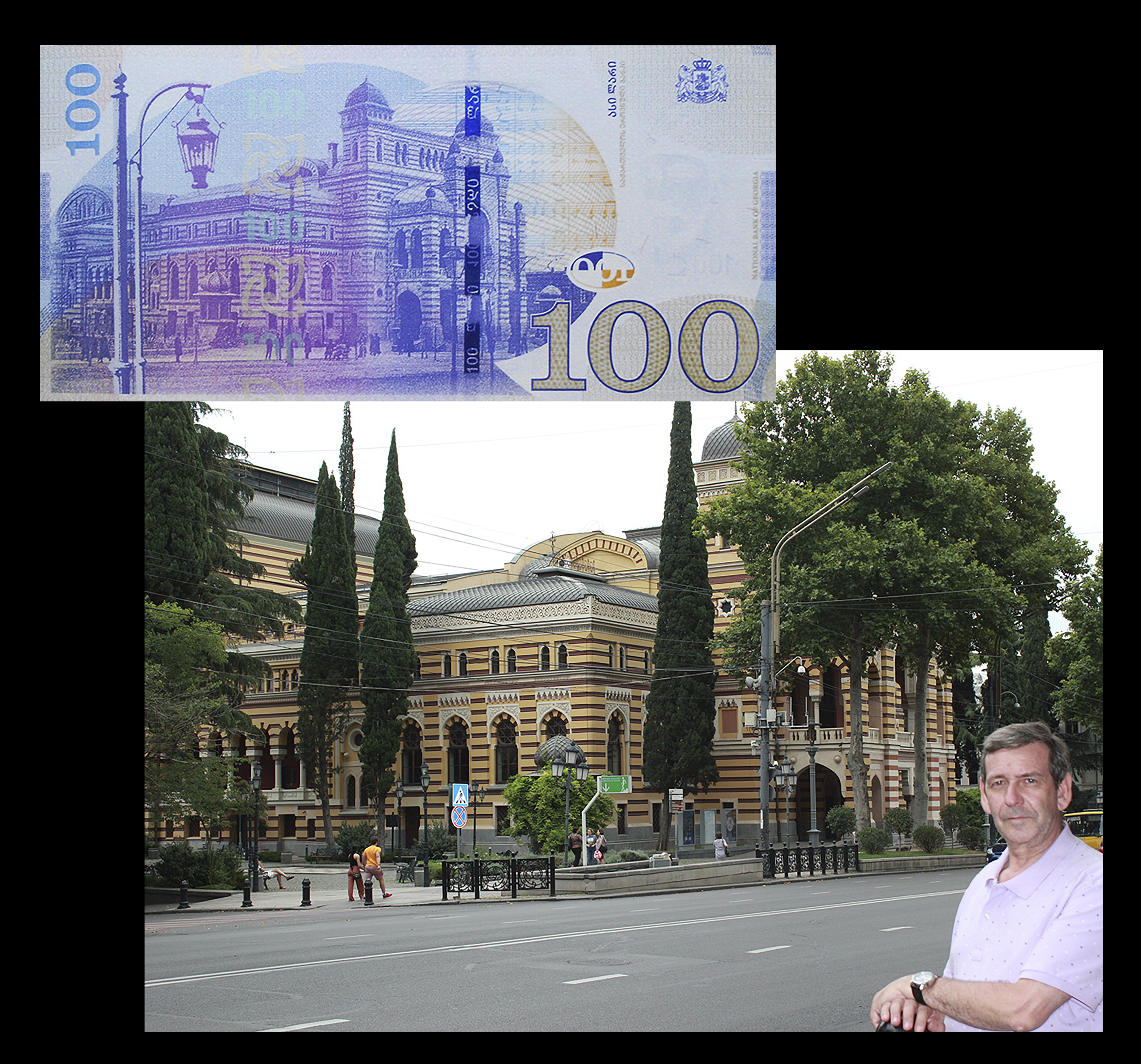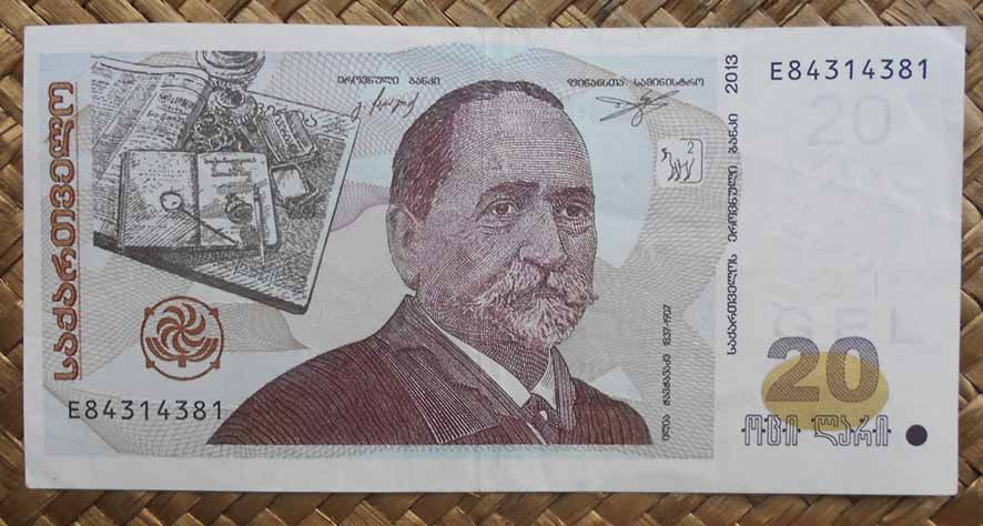 El billete de 20 laris de Georgia de 2013 nos muestra en su anverso a Iliá Chavchavadze (1837-1907) quien fuera escritor, periodista y abogado durante el gobierno ruso de Georgia, considerado uno de los padres fundadores del país y gran protector de la lengua georgiana; a su lado un ejemplar del periódico “Iveria” fundado y editado paralelamente a su carrera política, a finales del s. XIX.