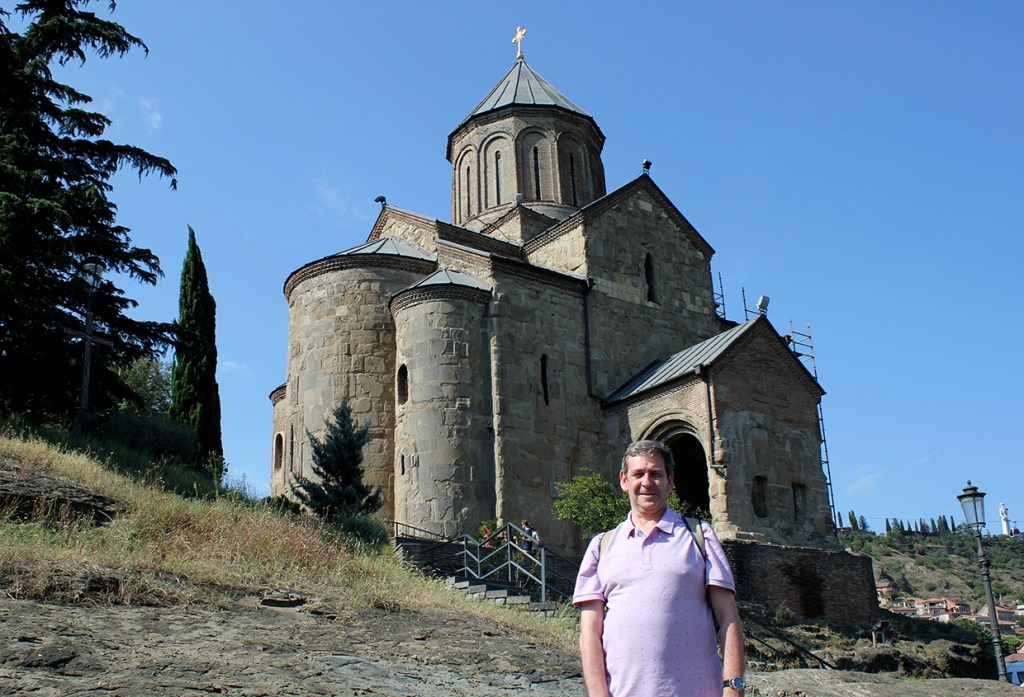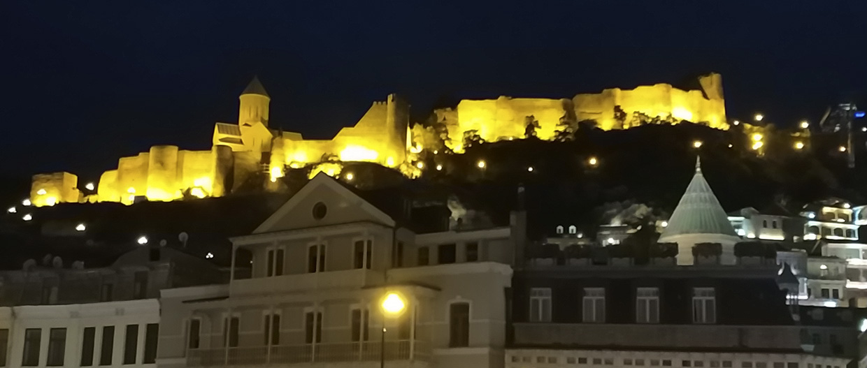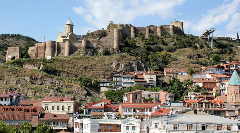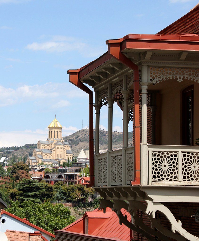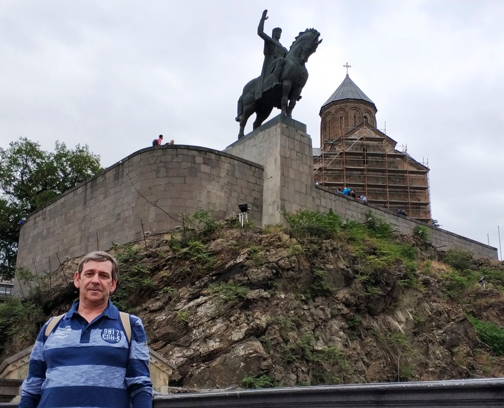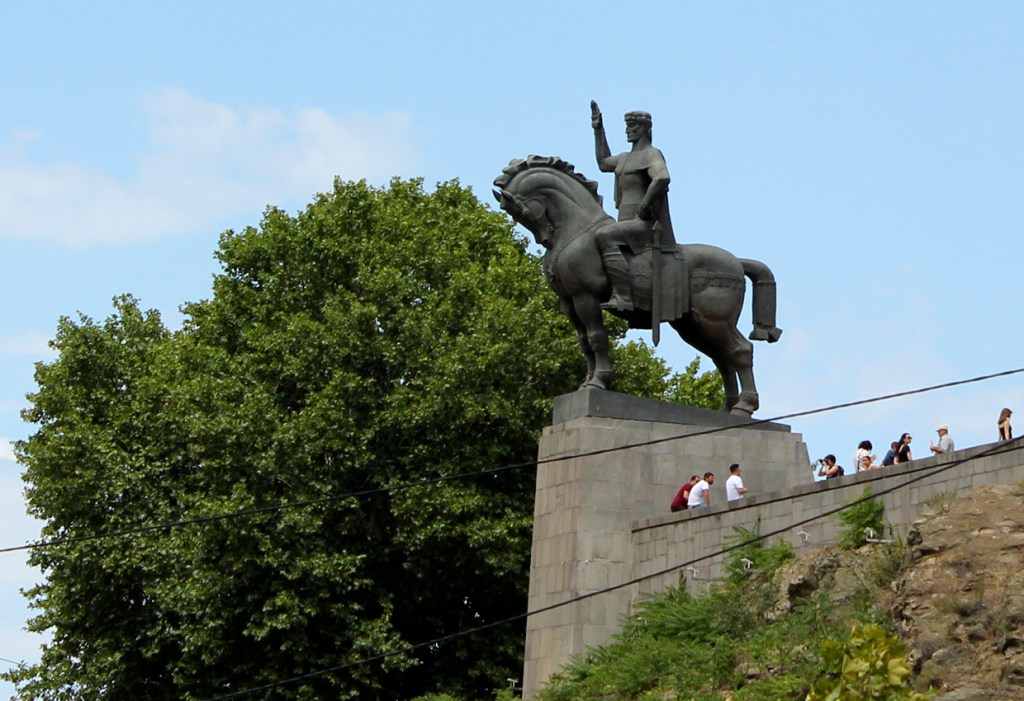 Un paseo por Tbilisi, además de llevarnos junto a Vakhtang Gorgasali en la colina junto a la iglesia armenia Metekhi a orillas del río Mtkvari, nos exige visitar el Teatro Paliashvili o teatro de la Ópera más importante del Cáucaso, la Catedral de la Santísima Trinidad (la más grande del mundo cristiano ortodoxo), pasear por las callejuelas del Old Tbilisi con sus típicas casas y balcones de madera, sumergirse en los baños termales de azufre y, …subir en teleférico al castillo fortaleza Narikala.