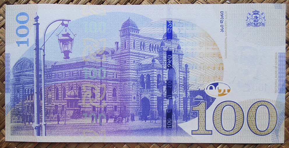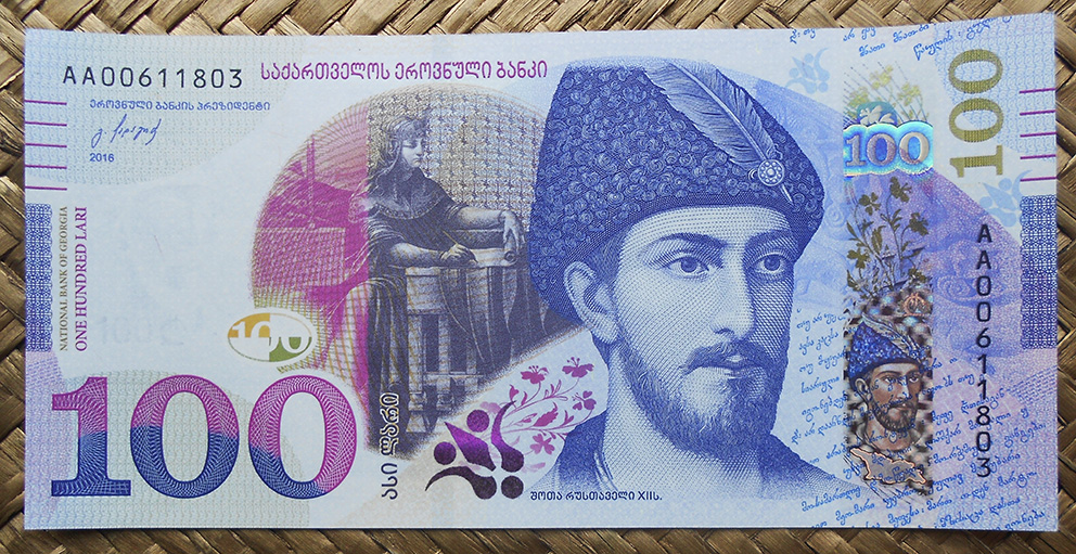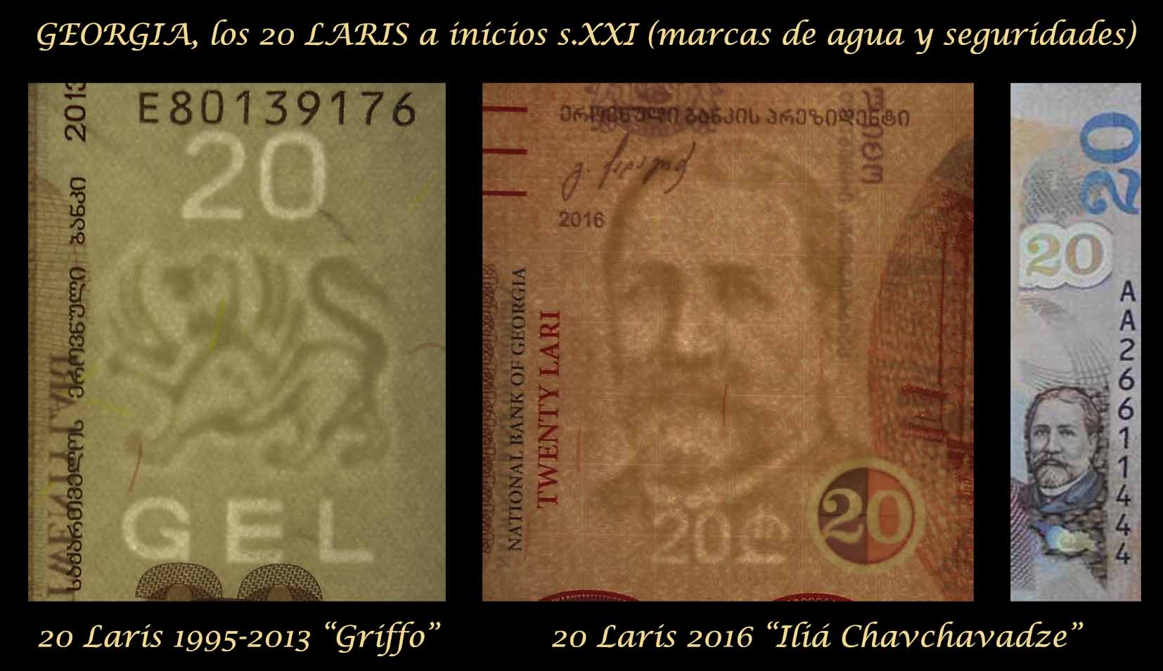 Sus marcas de agua nos muestran para el billete de 2013 al “grifo”, esa figura mitológica con cabeza de águila, garras y cuerpo de león, junto al valor del billete en nº y a su nombre como moneda, conocida como GEL. Mientras que para el billete de 2016 veremos el rostro del poeta y político que acompaña ambos anversos, el escritor georgiano Iliá Chavchavadze.