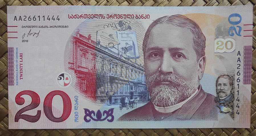 El billete de 20 laris de Georgia de 2016 nos ofrece en su anverso nuevamente a Iliá Chavchavadze, en un diseño completamente renovado del artista Bacha Malazonia, y al fondo un edificio en una calle de la época e imágenes de sus publicaciones impresas, su periódico Iveria y su revista Sakartvelos, su firma manuscrita y pertenencias personales (lupa, pluma, reloj, …).