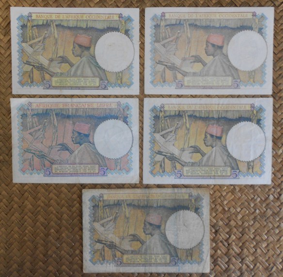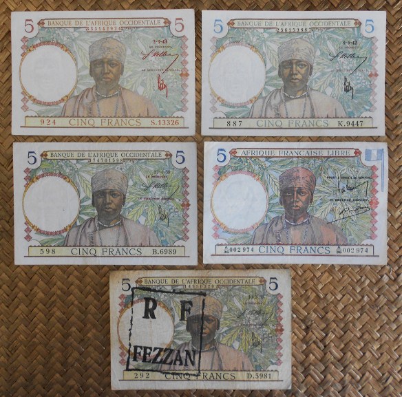 Los billetes de 1938 Libia resellado FEZZAN y de 1939, 1942 y 1943 de French West Africa fueron emitidos por el Banque de l’Afrique Occidentale (BAO) y llevan las firmas de Georges Keller como Le Président y de Edwin Poilay como Le Directeur Général. El billete de Equatorial French Africa de 1941 fue emitido por el “Afrique Francaise Libre” y lleva las firmas de Gal de Larminat como Le Conseil de Défense y de Pierre Denis como Le Directeur Financier