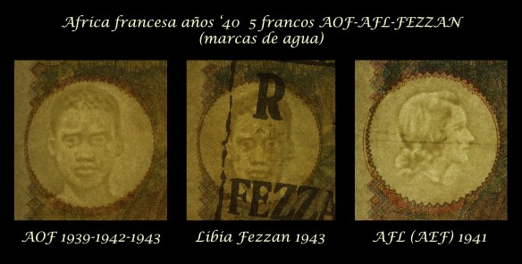 Contemplaremos los billetes de 5 francos del África Occidental Francesa de 1939, 1942 y 1943, el billete del África Ecuatorial Francesa de 1941 y el billete de Libia de 1943 resellado “Fezzan” sobre un ejemplar de 1938.