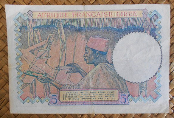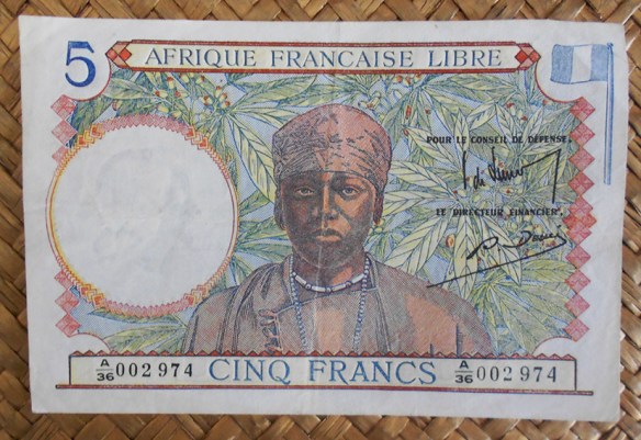 El ejemplar de 5 francos del AFL para Africa Ecuatorial Francesa de 1941 nos ofrece tonos azul oscuro en textos y valores, pero su emisor difiere de los anteriores. Debida a la interrupción de las relaciones comerciales entre Francia y sus colonias durante la Segunda Guerra Mundial, el general De Gaulle confió a la Caisse Centrale de la France Libre, la puesta en marcha en 1941 de la emisión billetes de banco, en particular en el África Ecuatorial Francesa y Camerún. Esto marcó el inicio de la transferencia de la responsabilidad en la emisión de billetes de banco de los bancos privados a los bancos públicos. Veremos en la esquina derecha del anverso la sustitución del valor en número por la bandera de Francia, en un momento en el que el colonizador estaba ocupado por la invasión nazi.