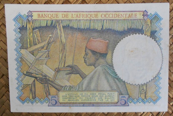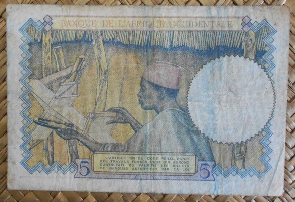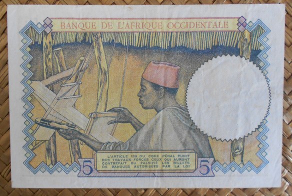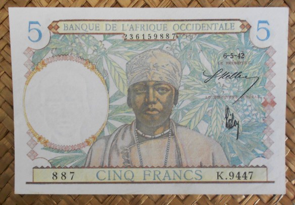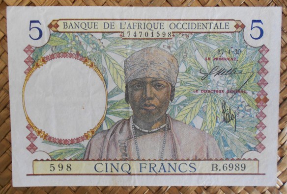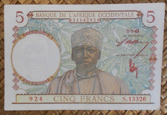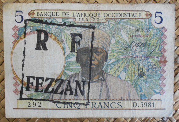 El ejemplar de 5 francos del BAO de 1938 resellado Fezzan para Libia en 1943 fue usado en el territorio de Fezzan ocupado por las Fuerzas Francesas Libres (FFL) en una Libia que al comienzo de la 2ª Guerra Mundial había pasado a formar parte del imperio colonial italiano. Fezzan, una región del sur libio, fue ocupada por el General Leclerc para los aliados franceses. Su administración decidió en 1943 sobreimprimir en billetes franceses de sus colonias del Africa Occidental un sello con las letras (RF y FEZZAN) en alusión a la República Francesa y a la región ocupada.