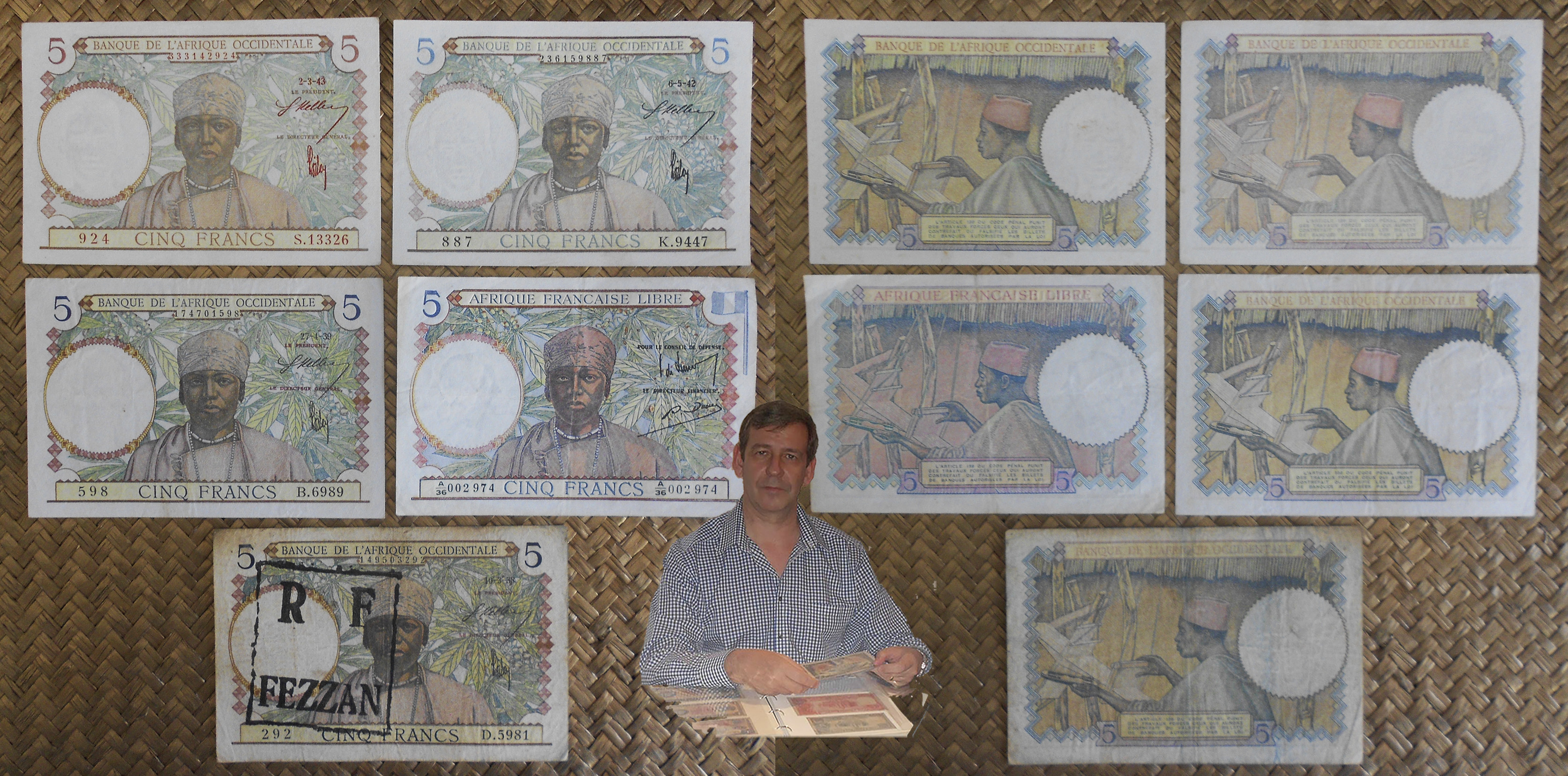 Los billetes de 1938 Libia resellado FEZZAN y de 1939, 1942 y 1943 de French West Africa fueron emitidos por el Banque de l’Afrique Occidentale (BAO) y llevan las firmas de Georges Keller como Le Président y de Edwin Poilay como Le Directeur Général. El billete de Equatorial French Africa de 1941 fue emitido por el “Afrique Francaise Libre” y lleva las firmas de Gal de Larminat como Le Conseil de Défense y de Pierre Denis como Le Directeur Financier
