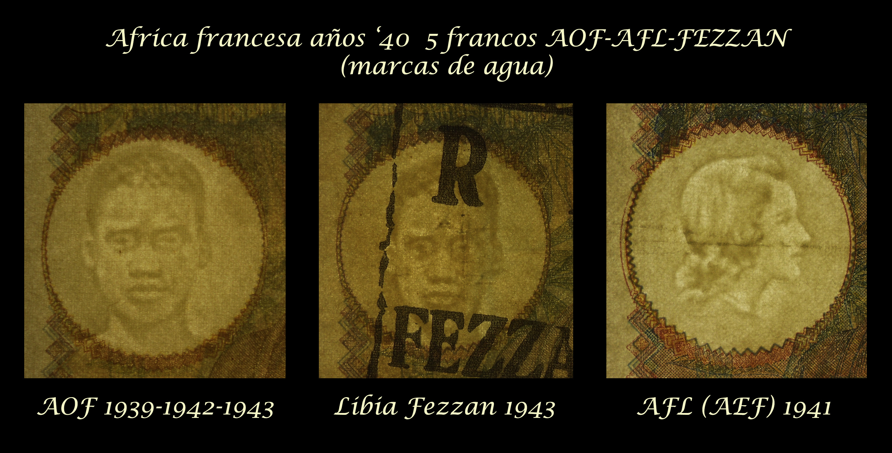 Siendo tan parecidos no fueron impresos en los mismos pliegos. Sus marcas de agua también son distintas, mostrándonos la cabeza de un nativo africano en los ejemplares de 1939, 1942 y 1943 para AOF y del de 1938 resellado del AOF para Libia, mientras que nos deleitan con la cabeza de una dama francesa en perfil en el de 1941 del África Ecuatorial.