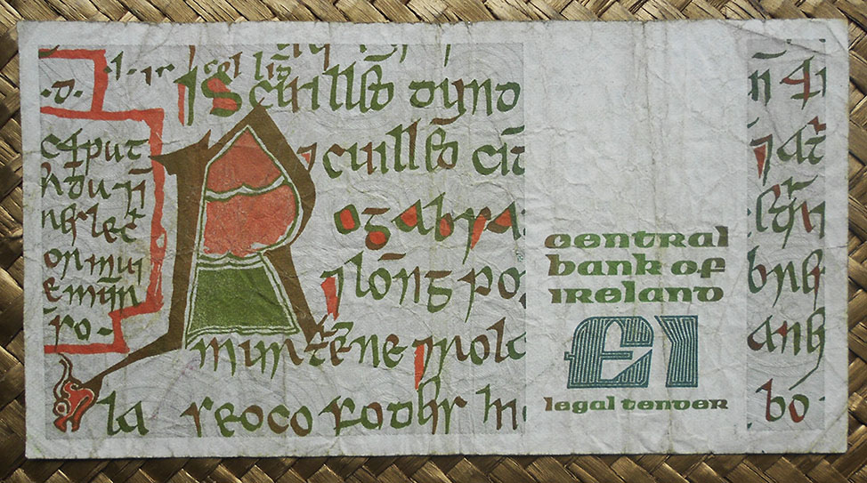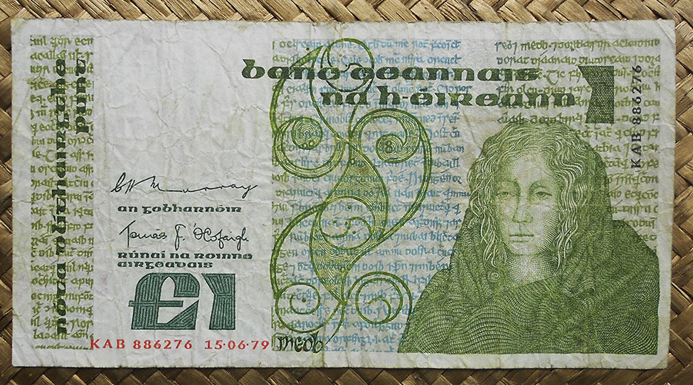 El billete de 1 libra de Irlanda de1979, en tonalidad verde, nos muestra en su anverso a Medb (legendaria Reina mitológica de Connacht, territorio que abarca los condados de Galway, Leitrim, Mayo, Roscommon y Sligo); en su reverso se reproduce un viejo manuscrito irlandés del siglo XII. Lleva las firmas de C. H. Murray y T. F. O’Cofaigh.