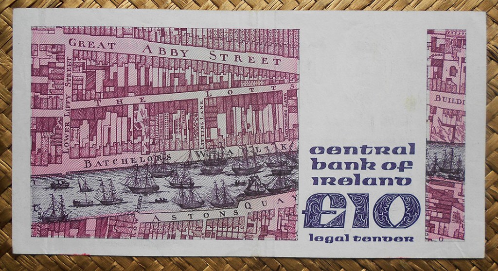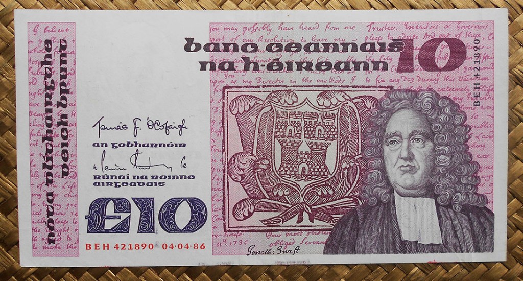 El billete de 10 libras de Irlanda de 1986, en tono púrpura, ofrece en su anverso un retrato del escritor satírico Dean Jonathan Swift y el escudo de armas de Dublín. En su reverso aparece un recorte de un mapa callejero de Dublín de 1756. Lleva las firmas de T. F. O’Cofaigh y M. F. Doyle.