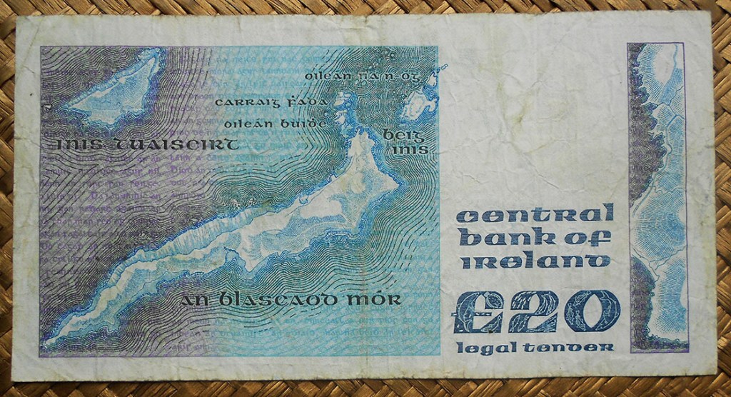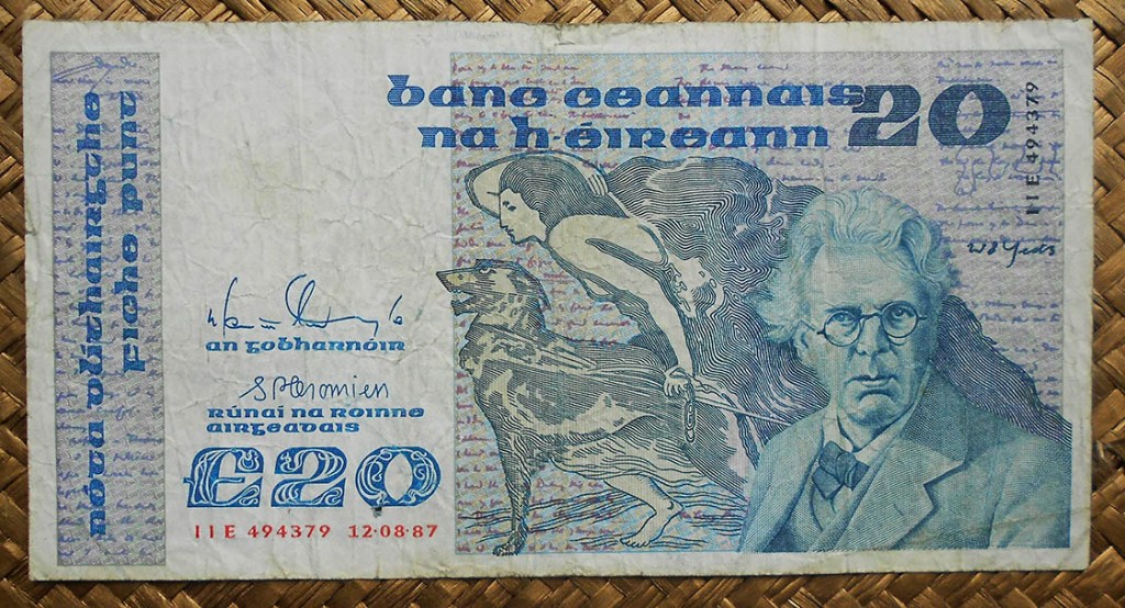 El billete de 20 libras de Irlanda de 1987, en tono azulado, nos muestra en su anverso el retrato del dramaturgo William Butler Yeats, junto al héroe mitológico Cú Chulainn (el Aquiles irlandés). Su reverso nos ofrece la imagen de las islas Blasket, en el condado de Kerry. Sus firmas M. F. Doyle y S. P. Cromien.