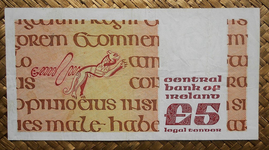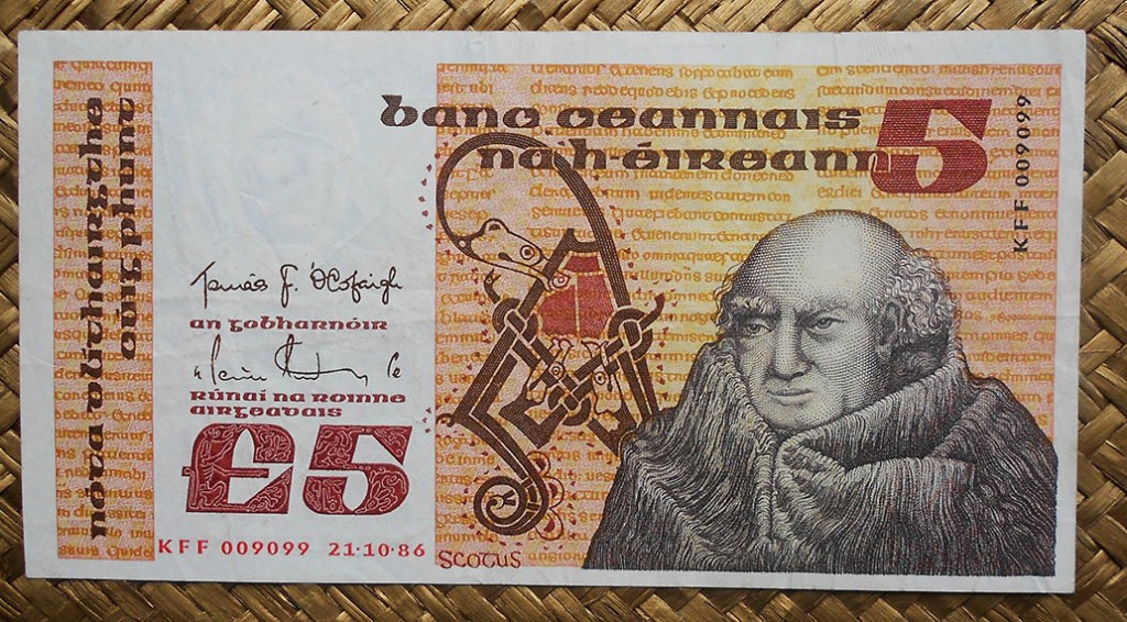 El billete de 5 libras de Irlanda de 1986, en tonalidad anaranjada, nos muestra en su anverso el retrato del teólogo Johannes Scotus Eriugena y en su reverso un extracto del libro de Kells, del siglo VIII. Lleva las firmas de T. F. O’Cofaigh y M. F. Doyle.