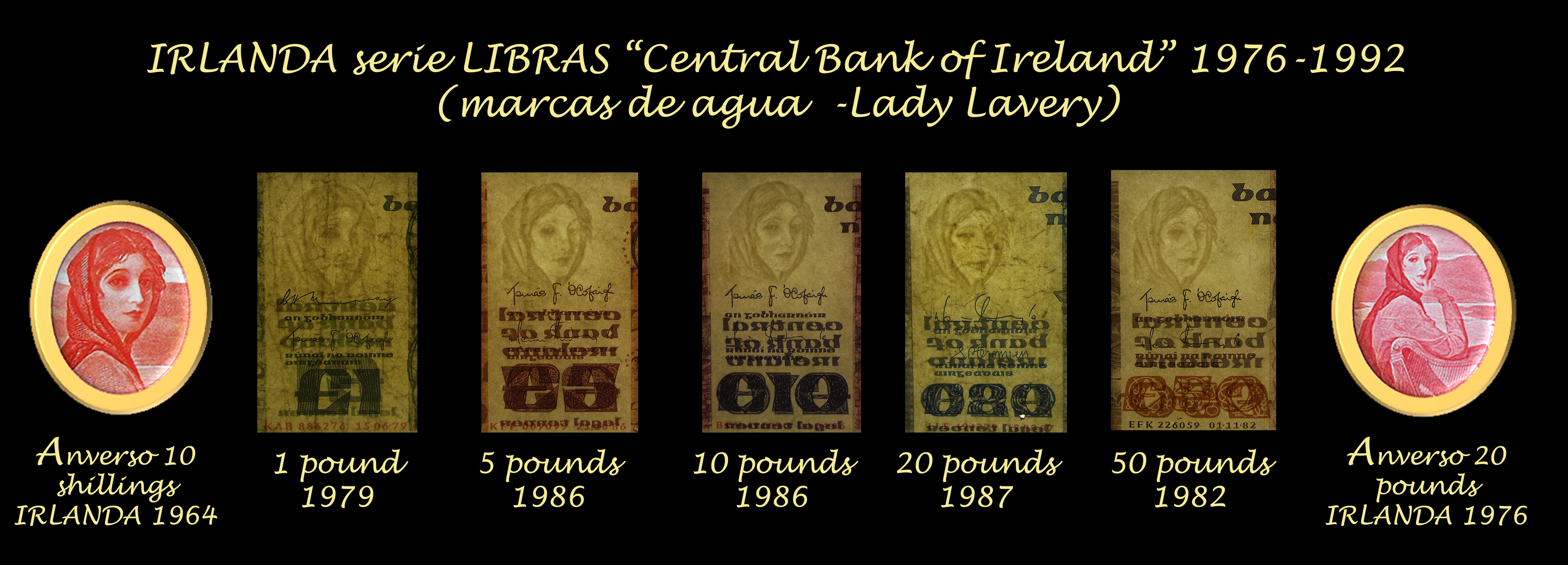 Toda la “familia” lleva como marca de agua el busto de Lady Lavery, a modo de personificación femenina de Irlanda.