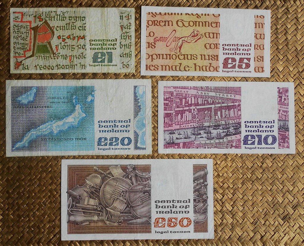Sus anversos y reversos nos ofrecen unos grabados coloristas muy peculiares, mezcla entre caricatura y retrato, mostrando tanto personajes como entornos de actividad en un recorrido histórico del país, que hacen de ella una de las más bonitas de la notafilia europea del último tercio del siglo XX, aunque su reparto de cromaticidades es más bien austero. Sus textos en irlandés (gaélico moderno) en los anversos y en inglés en los reversos.